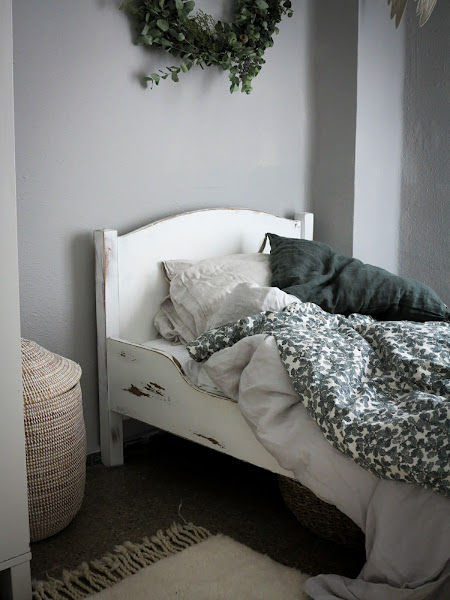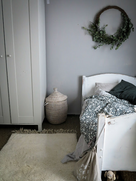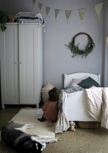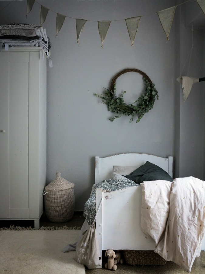 Otra nueva joya que tiene es la corona que le he hecho y corona su cama, ya os hice un pequeño adelanto por instagram, aunque ahora la he rellenado con más ramas. Es una corona muy sencilla de hacer y que dará un toque único. Sólo necesitamos una estructura de ramas, eucalipto y algunas flores silvestre, para enfatizar ese estilo campestre y desenfadado.