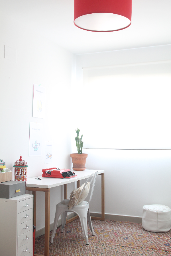 Hace poco tiempo hemos vuelto a realizar algunos cambios en el despacho. Teníamos la necesidad imperiosa de redecorarlo y ubicar varios objetos que se han convertido en algunos de nuestros imprescindibles. Nos hacía falta más espacio de trabajo y tras realizar muchas búsquedas dimos con una réplica de la silla tolix en color blanco que nos encantó y no pudimos resistirnos a ella. Además, mis padres nos regalaron un maravilloso cactus, que lejos de terminar en la terraza, ha resultado uno de los protagonistas de toda esta historia. A partir de su ubicación estratégica al lado de la ventana, decidimos que era el momento de añadir un toque bohemio y marroquí a la vez. Pronto trasladamos la alfombra bereber desde el salón y sacamos a relucir la máquina de escribir de mi madre, la cual atesoro con tantísimo cariño. Ahora, además de tener el espacio de trabajo más amplio, nos sentimos muy a gusto!!!