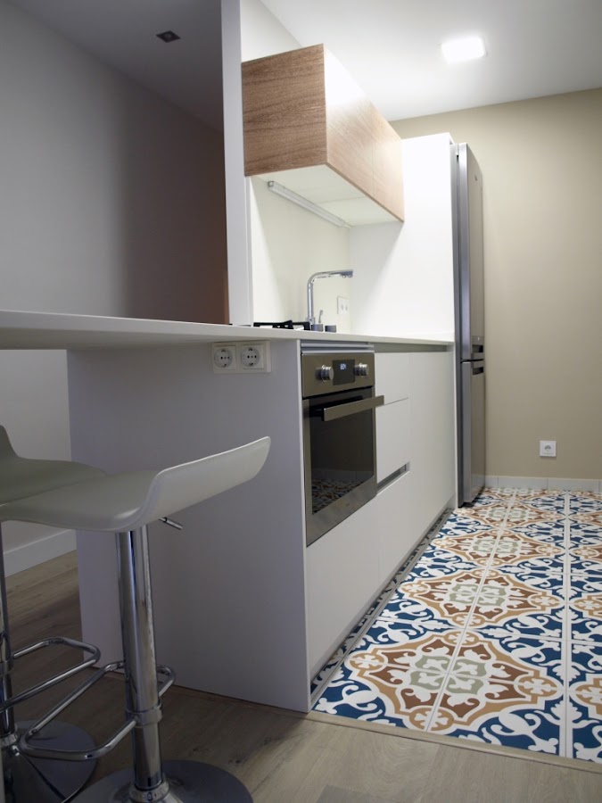 El complemento perfecto a la uniformidad del blanco del mueble y la encimera es el pavimento hidráulico de Apavisa, colorido y modernista, un acabado perfecto para este céntrico apartamento que le aporta un plus de personalidad.