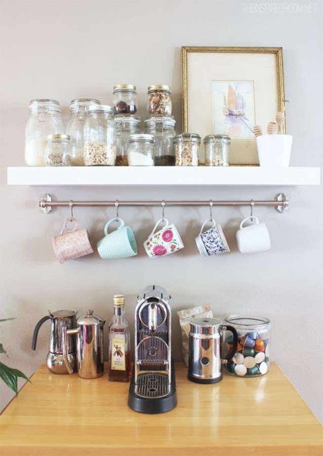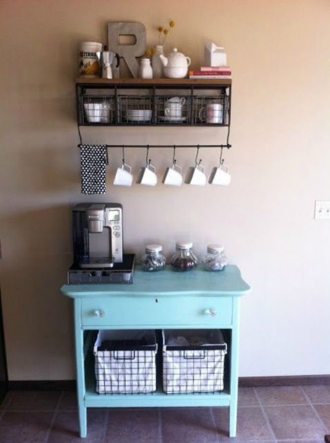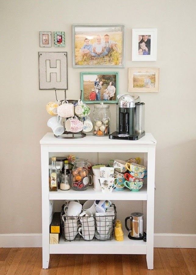 CARRITOEs la idea que menos esfuerzo requiere, no tenéis que montar muebles ni os va a ocupar mucho espacio, en un rincón de la cocina o del salón será el lugar ideal. Sólo necesitaréis un carrito y ponerlo cerca de un enchufe para poder conectar la cafetera. En él podéis poner todo lo necesario para hacer el café en todas sus versiones: tazas pequeñas, grandes, cápsulas o botes de café, azúcar, cucharillas, accesorio de batir leche para capuchino, etc...