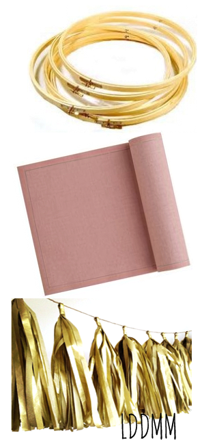 Pintar los bastidores con spray dorado, tensar la tela y pegar los motivos de cartulina o foam de purpurina, rematamos colgando algunos hilos con borlas al bastidor. Si no sabes hacer las borlas, pincha aquí.