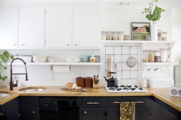 Han combinado armarios cerrados con estantes abiertos. Los armarios superiores los han llevado hasta el techo, aprovechando el espacio superior que antes se perdía, y permitiendo así la colocación de estantes a media altura más prácticos que permiten tener las cosas más a mano y hacen que el espacio parezca más grande. Además, en la pared junto a la barra, la colocación de estantes consigue una mayor sensación de ligereza y vinculación con la zona de comedor ya que ahora no existen armarios que obstaculicen.