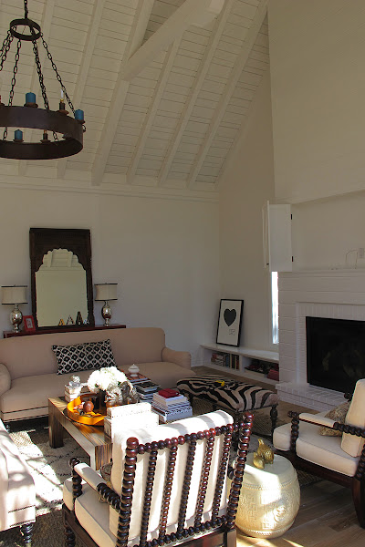 Y este es el Después ... un gran cambio en el que se ha renovado absolutamente todo el mobiliario, textiles y complementos para crear un estilo fresco, moderno y sobre todo acogedor . Si os fijáis, se ha respetado totalmente la distribución anterior con esa gran chimenea como protagonista de la estancia , y con una correcta elección de los cojines y alfombra , se ha llegado a un ligero estilo Boho típico de esta joven diseñadora .