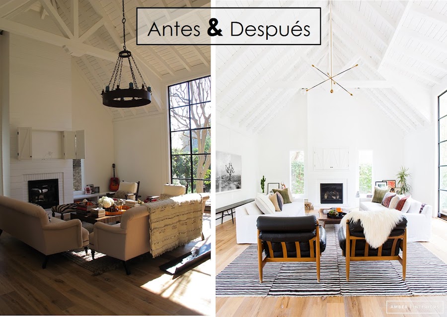 En esta ocasión , vamos a ver la reforma del salón de una casa californiana llevada a cabo por la diseñadora Amber Lewis , propietaria del estudio Amber Interiors en Los Ángeles . Es un salón de grandes dimensiones en el que la distribución del mobiliario no está nada mal , pero por supuesto ya ha cumplido su cometido y tras quedarse anticuado pide a gritos un cambio de look .