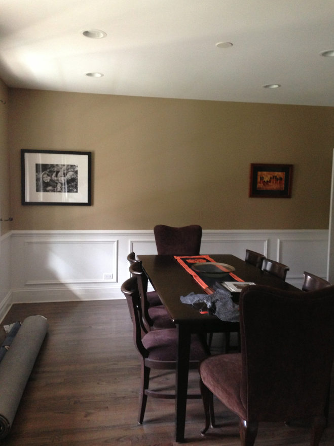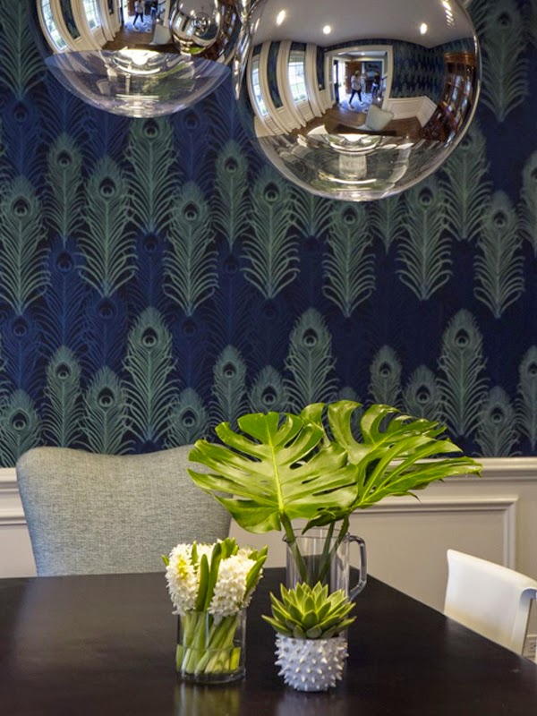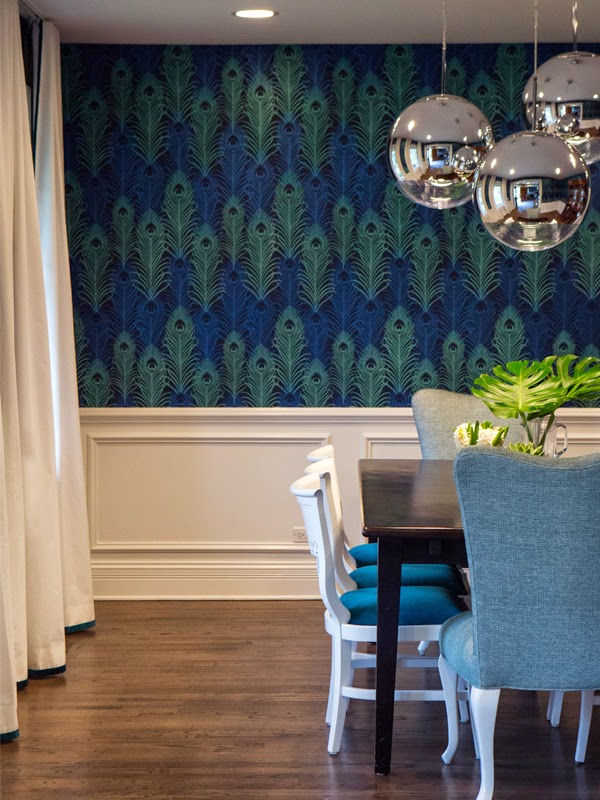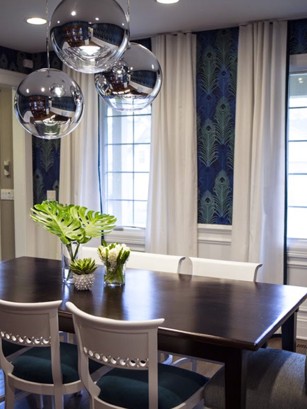 En el comedor lo más llamativo el papel de imitación a la pluma del pavo real con unos colores vibrantes, tres lamparas de aluminio protagonista de la estancia, sillas de dos modelos diferentes tapizadas.