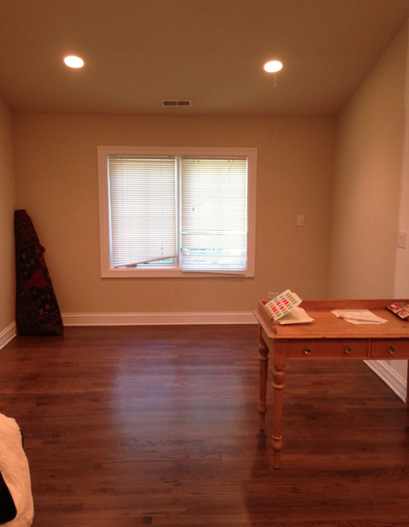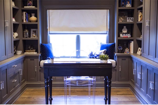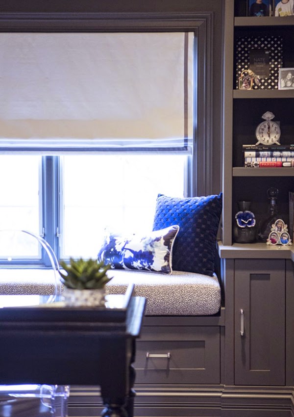 En el despacho anteriormente desaprovechado y vació; lleno de librerías hechas a medida con una gran capacidad de almacenaje y un color gris fuerte, y aprovechando la ventana creando un precioso rincón para desconectar.