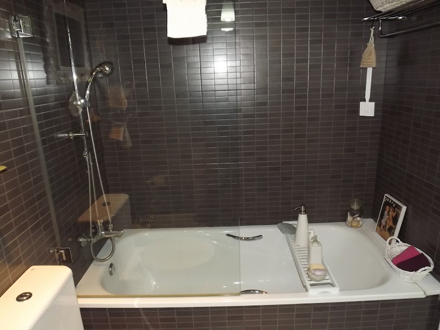 Las baldosas de toda la parte de la bañera fueron pintadas con varias capas de pintura especial en color blanco...