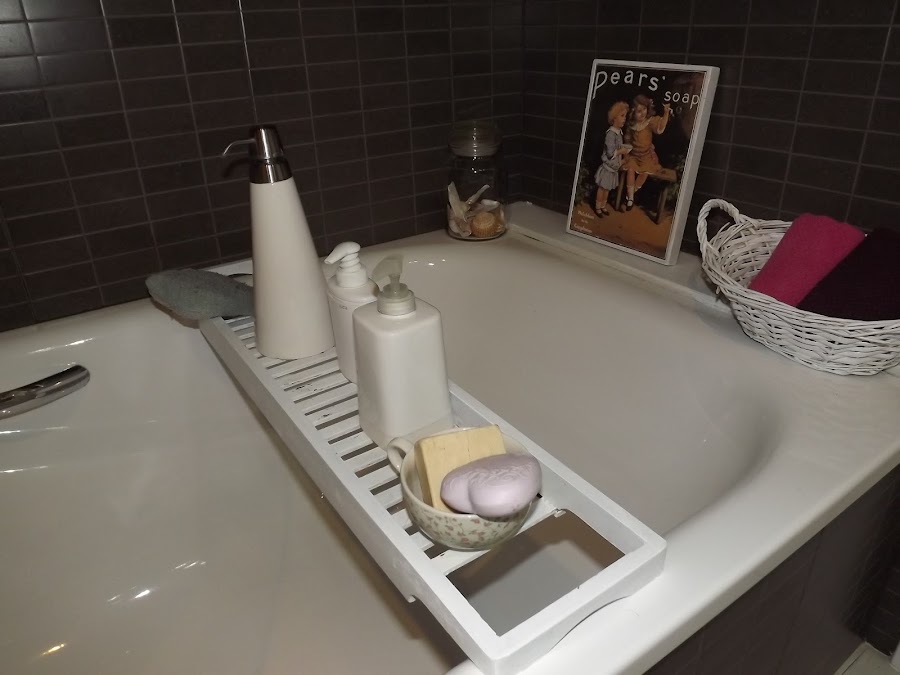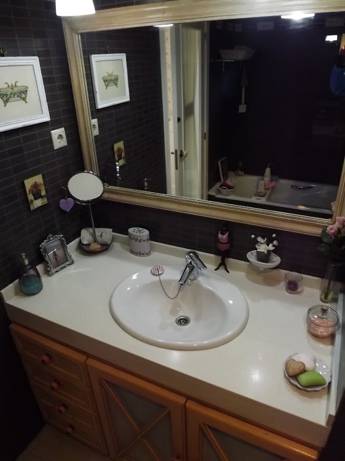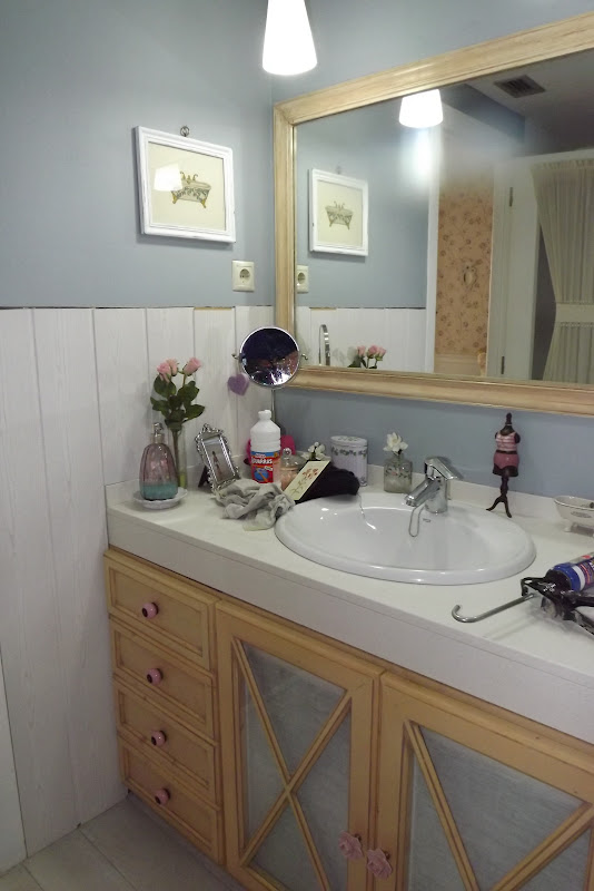 Y eso fue todo chicas, nada más...Con ello el cuarto de baño parece otro totalmente diferente. Con el paso del tiempo hemos cambiado también el suelo, retirado las grandes baldosas de cerámica por el roble desgastado que ya todas conocéis y no descartamos en un futuro retirar la bañera para sustituirla por una gran cabina de ducha. Pero eso tendrá que esperar, me pongo de los nervios solo de pensar en paletas trajinando en mi casa...