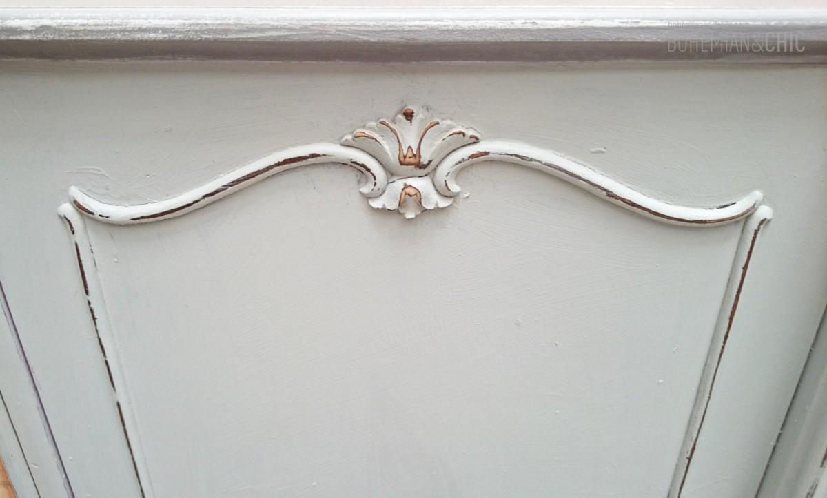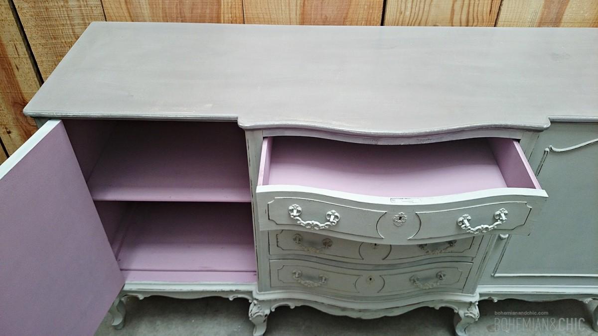 Este aparador de estilo Luís XV de los años 50 con una preciosa talla que mantiene sus tiradores originales de bronce. Lo hemos actualizado dándole un aire romántico en tonos suaves el exterior se ha pintado con pintura a la tiza( ecofriendly) en dos tonos la tapa en un gris marengo y el resto en un gris azulado super suave.El interior de un tono malva muy suave para dar contraste a toda la pieza la .Y acabado con un pequeño decapado en las tallas y finalizado con cera natural.Destacar que la trasera ha sido también decorada con un motivo floral. Por lo que el aparador puede ubicarse en multiples espacios. tanto del hogar como de un negocio ideal en zonas de paso como isla en una cocina como mostrador en un comercio