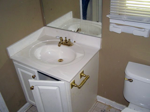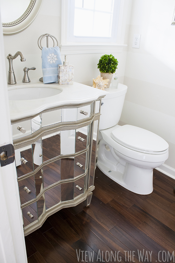 El mueble de lavabo se ha hecho a partir de una cómoda de cajones en espejo y sobre esta se ha adaptado el lavabo y un sobre de mármol.