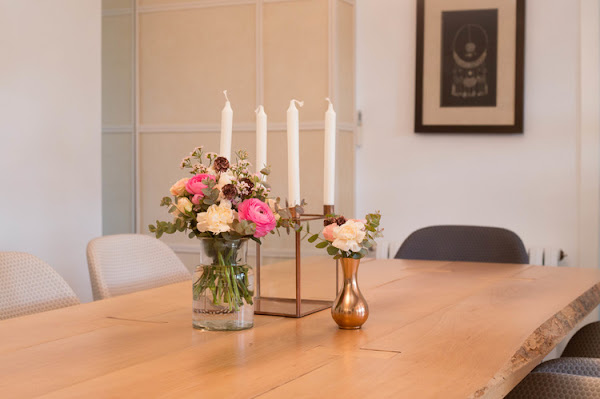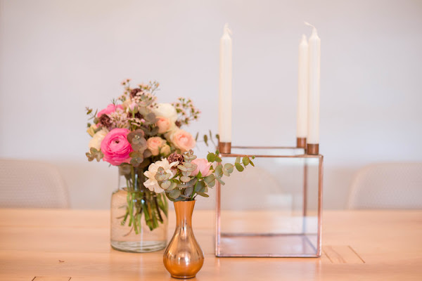Como detalles decorativos para el centro de mesa, elegimos un candelabro de diseño nórdico en cobre, y un par de jarroncitos en dos tamaños diferentes para lograr una composición sencilla, armónica y atemporal.