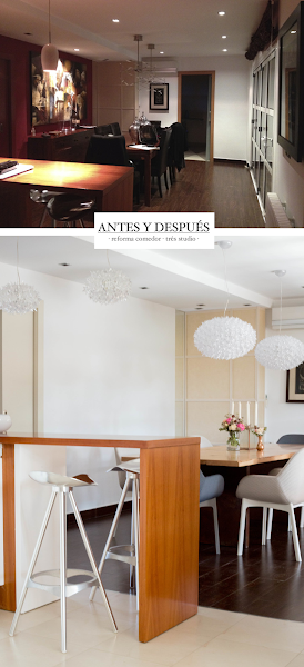 Por supuesto, la pared de detrás de la mesa la pintamos de blanco, lacamos puertas y otros muebles, que ya no pegaban con el nuevo look, y decidimos poner una composición de fotos familiares (que está por llegar) y que le aportará muchísima calidez a la estancia. Afortunadamente, uno de los familiares es fotógrafo y más adelante (cuando tengan más tiempo, porque con el trabajo van bastante liados), se harán una sesión de fotografías en familia y colgaremos las imágenes. Ya os lo enseñaremos =)