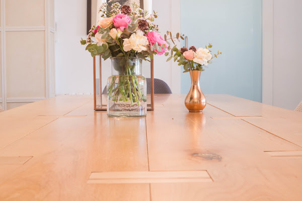 La mesa la encargamos a modo de tablones naturales de haya, donde el corte, la veta y los nudos se apreciasen bastante; estos tablones están unidos como en las construcciones típicas americanas, con travesaños de la propia madera. En directo la verdad es que resultaba preciosa y casi, casi, ¡escultórica!