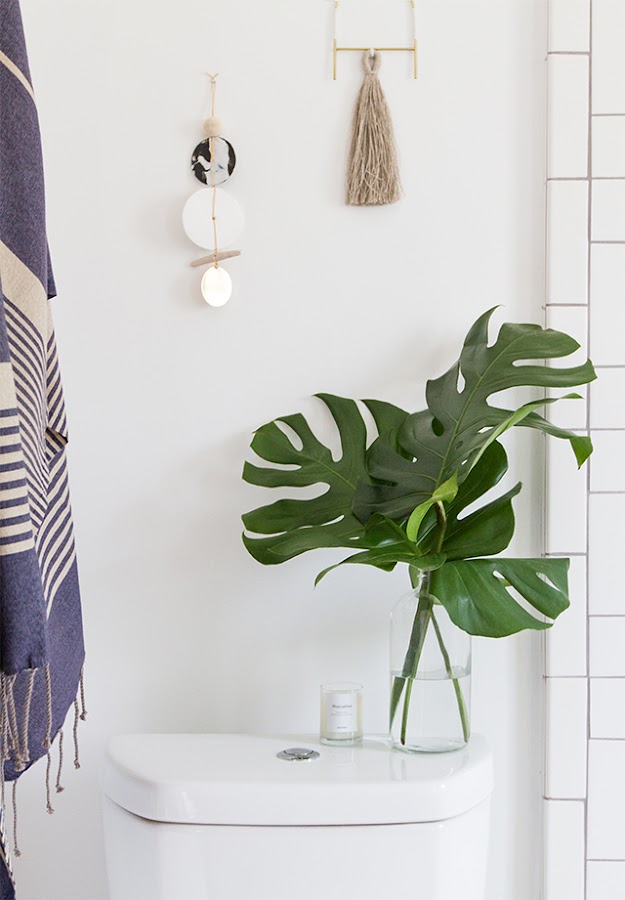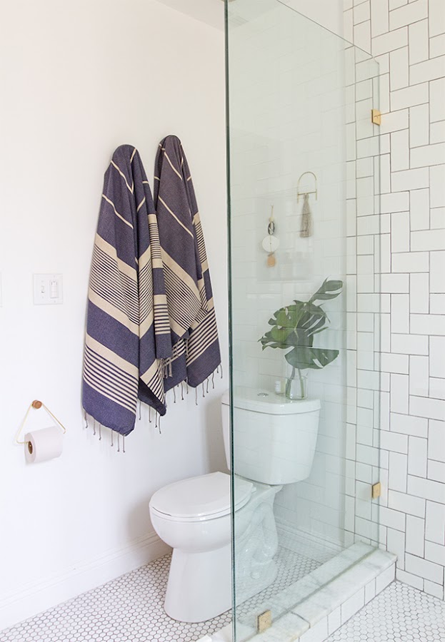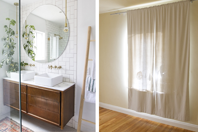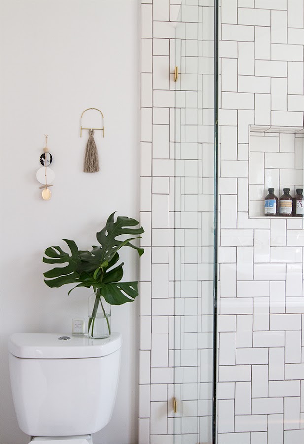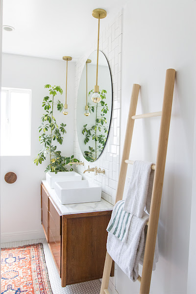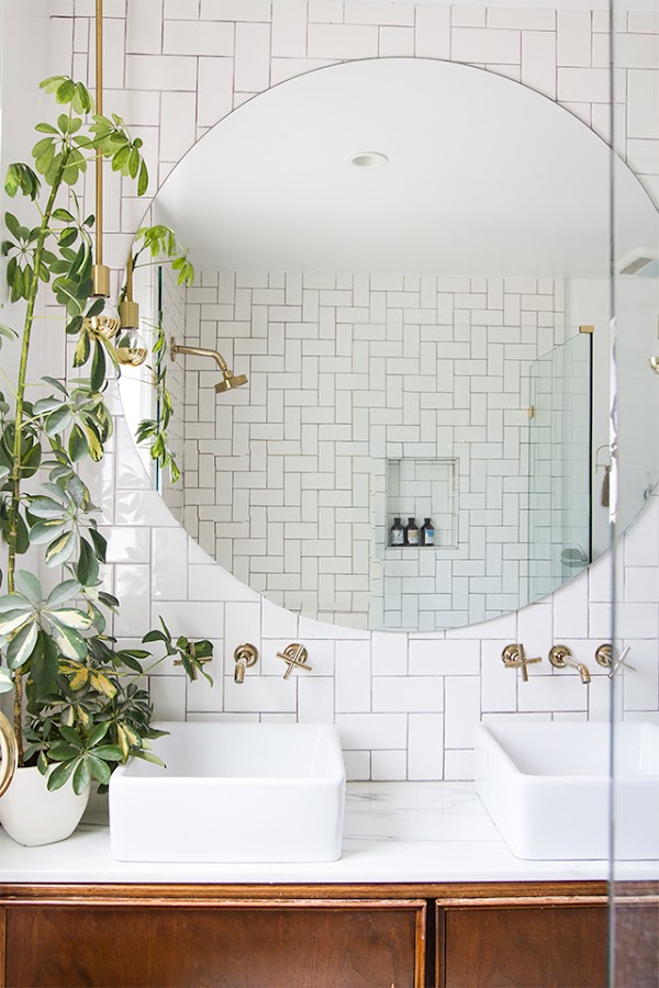 Con ejemplos de reforma del baño como el que os traemos hoy al blog, está claro que todo es posible y que no hay que agobiarse cuando tenemos que hacer un obra que requiere una gran transformación en casa. Hay que tomarlo con calma, planificar bien el proyecto y dejarnos asesorar para conseguir el espacio que necesitamos. En nuestras reformas vemos a menudo cómo el hecho de cambiar el baño de sitio supone un extra de agobio por parte de los clientes, pero esto no es así en absoluto y una vez empezamos la obra, todos ven que ha merecido la pena el esfuerzo. Por eso el antes y después de hoy nos parece genial para que veáis que con un buen proyecto y ganas todo sale a la perfeccción. ¡Fuera miedos! Sarah Sherman, en su blog Stories, así nos lo demuestra con el baño nuevo que se hizo en lo que era un dormitorio. Una base en blanco, combinando pintura y azulejo, le da mucha más amplitud. Otros grandes aciertos son el espejo redondo a medida (muy de tendencia), el toque vintage del mueble de madera que hace de soporte para los lavabos y le da un estilo más personal, los apliques y grifería en dorado, y la planta schefflera. ¡Cuánto mejoran y alegran las plantas estos espacios!