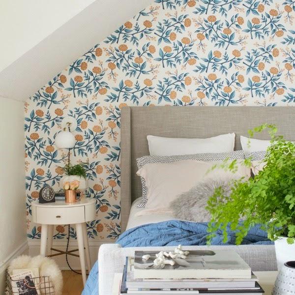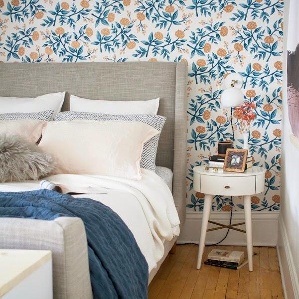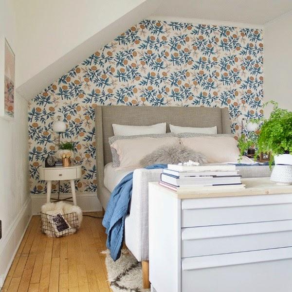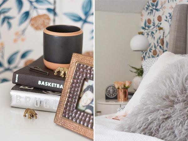 Ahora toca analizar los revestimientos. Se suprimió el color gis oscuro de la pared del fondo, en la que se sitúa ahora el cabecero, y se sustituyó por un papel pintado de delicado estampado floral. Lo cual potenció la luz y consiguió acaparar todas las miradas al conjunto estético que crea junto con el cabecero y las mesillas.