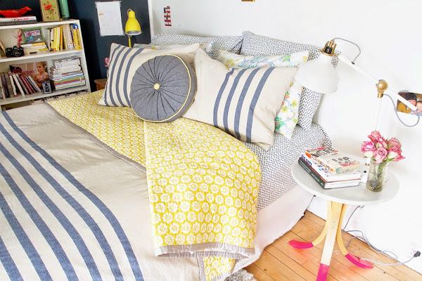 Los textiles se han cambiado por unas fundas de algodón en un blanco luminoso combinada con algún tejido en color azul y alguna funda de almohada en rosa muy suave, creando una sensación visual mas luminosa y fresca que con los antiguos textiles.
