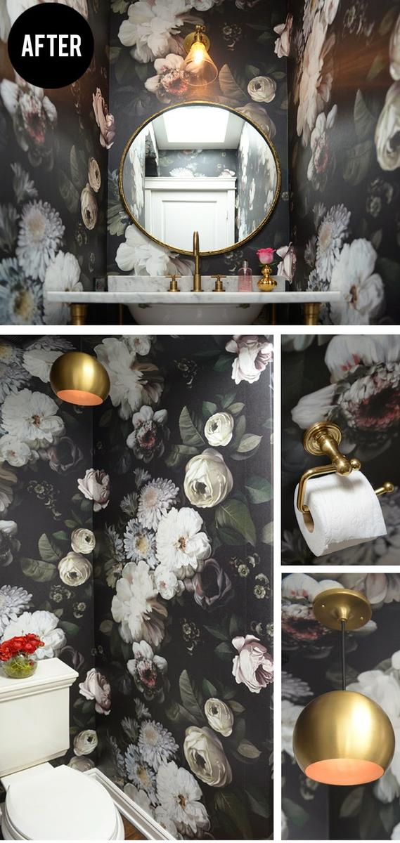 Mármol, papel de flores blancas con fondo negro, apliques, grifería y accesorios en oro; la combinación perfecta.