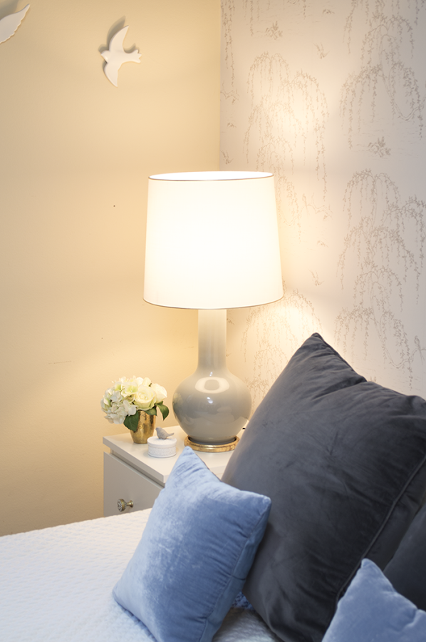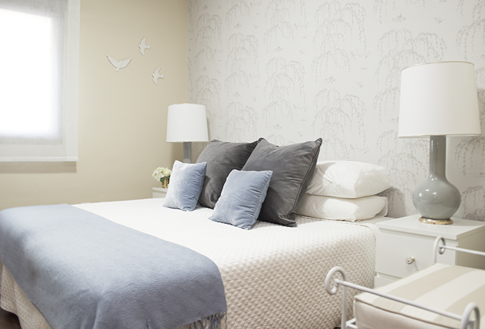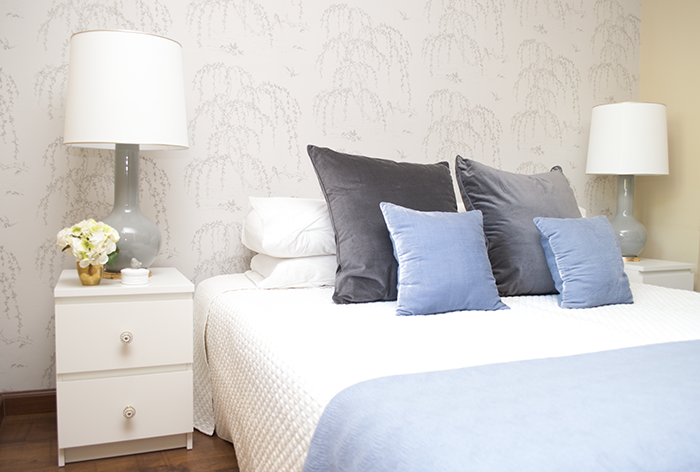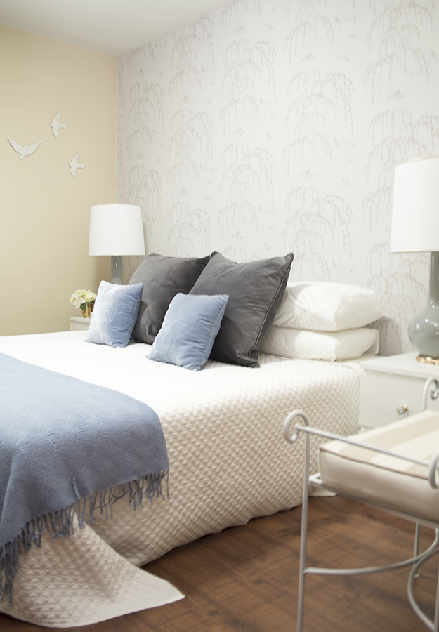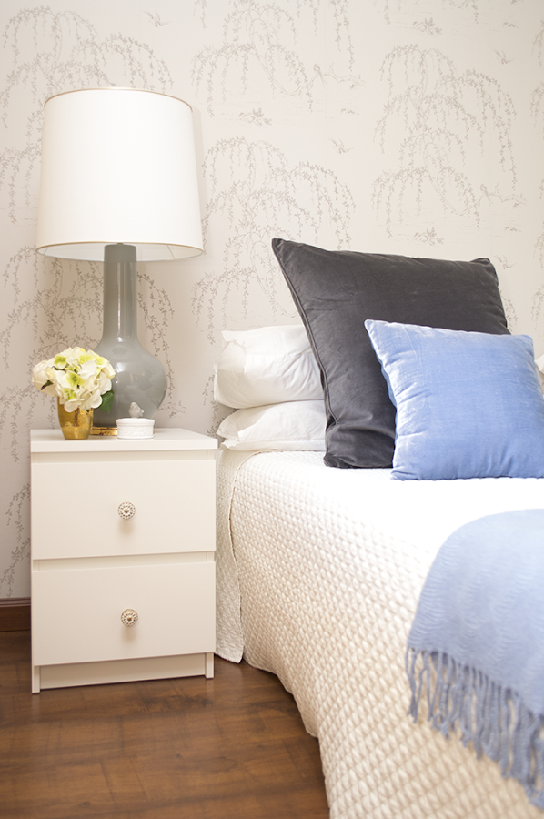 Así de fácil y rápido ha cambiado este dormitorio :) . Un papel bonito, combinado con unas mesitas de noche “customizadas”, cojines, una colcha, un estor de lino blanco a medida y mis lámparas favoritas.