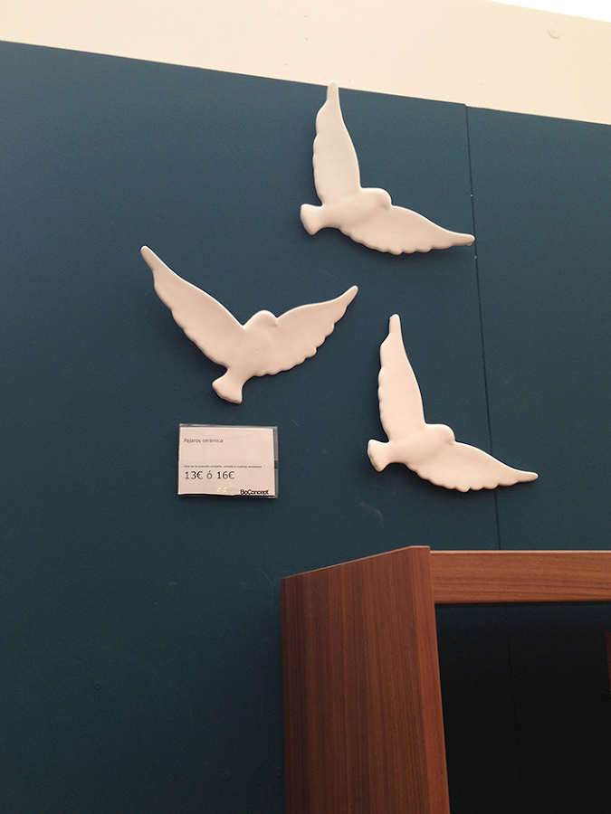Bueno, me topé por casualidad con estos pájaros y no me pude resistir a comprárselos a Carmen porque son idénticos a los que tiene el dibujo del papel que pusimos :)