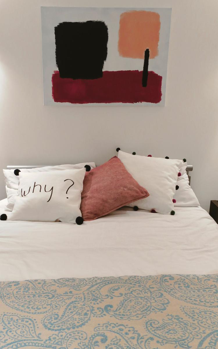 Ya sabéis, lo primero, cambiar el cuadro por otro más luminoso y alegre. Este lo hicimos en un momento combinando los colores que después íbamos a usar en el resto de los complementos. Los que sepáis de pintura y de arte me podéis sacar todos los fallos que queráis. Como os digo siempre, esto es solo una forma rápida y barata de adecentar un piso de alquiler de manera temporal.