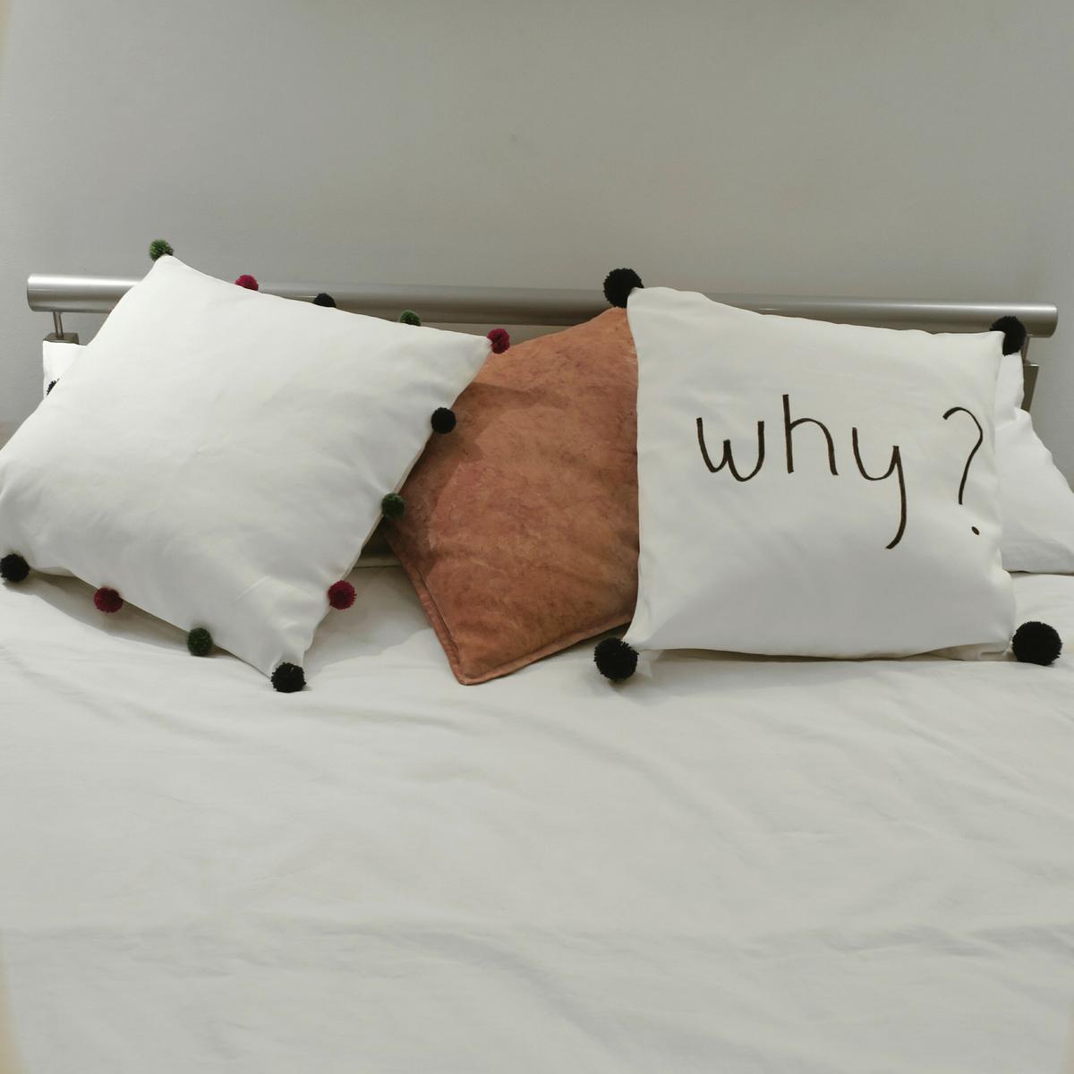 Por otro lado, la funda del edredón, fuera. La funda nueva en blanco da mucha luz, y para completar la cama, los cojines DIY que os enseñaba el otro día en este post.