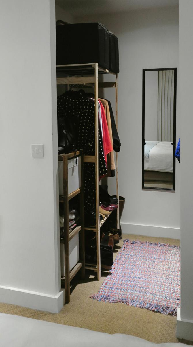 Este dormitorio tiene un mini-vestidor que había que optimizar. Para aprovechar al máximo el espacio, combinamos el armario negro que ya estaba a un lado con un burro de madera y una estantería al otro. En la pared del fondo, un espejo para verte mientras te vistes (utilizamos estas pegatinas Command, son una maravilla!) Y para dar un poco de alegría a la moqueta, una alfombra de colores!