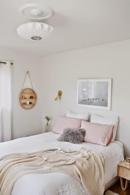Se trata de un dormitorio en tonos neutros, intuimos que de una chica, por sus colores pastel y porque es el tono rosa el que predomina en la mayor parte de la decoración. Junto con una mezcla de textiles neutros y mobiliario de líneas sencillas en maderas claras, este dormitorio es un claro ejemplo de que no hace falta una gran inversión para darle un aire nuevo y renovado a cualquier habitación.