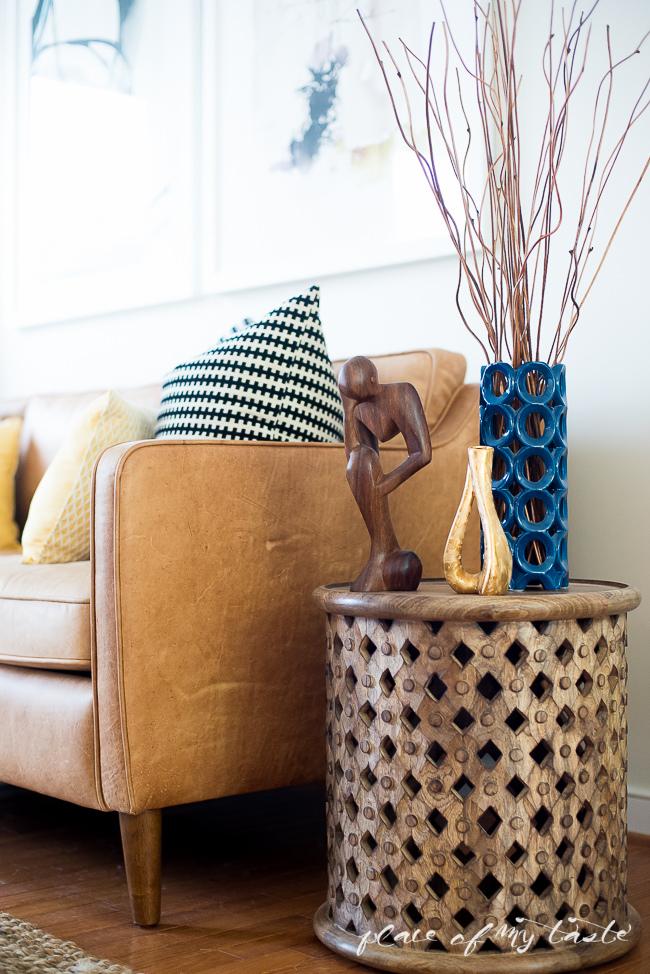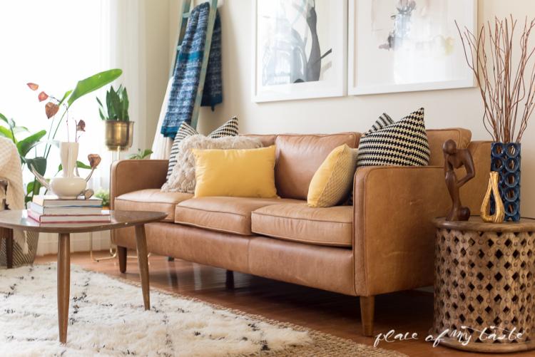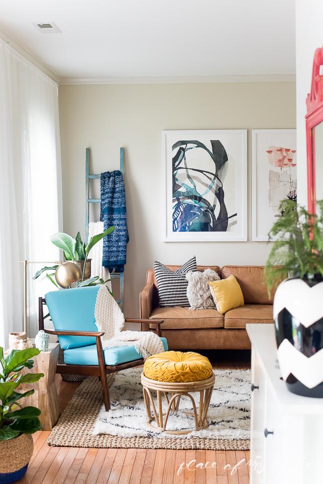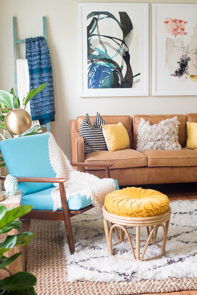 Y si bien es cierto que podemos apreciar ciertos detalles característicos del estilo boho chic como la mezcla de textiles, el uso de colores intensos y el empleo de plantas, se han incorporado otros elementos que le dan un cierto aire retro y que nos evoca a la estética mid-century tan popular hoy en día. Para ello sus aliados fueron unos cuantas piezas nuevas como el sofá de cuero camel, inspirando en la estética de los años 50, y otros hallazgos vintage como la silla danesa de mediados de siglo que retapizó en un intenso color azul, y una desgastada mesita de centro.