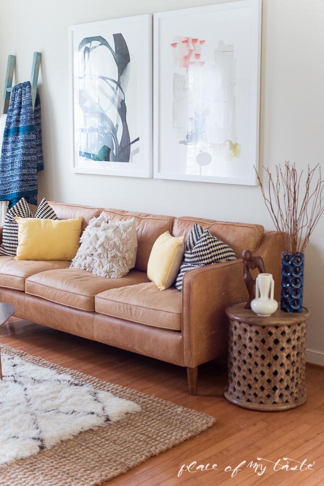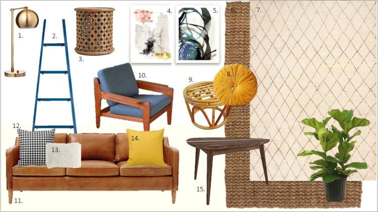 1. Lámpara de bronce 2. Escalera decorativa azul 3. Taburete de madera tallada 4. Acuarela de Kelly Ventura1 5. Acuarela de Kelly Ventura 2 6. Alfombra de yute 7. Alfombra de lana Beni Ourain 8. Cojín de terciopelo redondo 9. Mesa/taburete de ratán 10. Sillón danés estilo midcentury 11. Tresillo de cuero color camel 12. Cojín de pata de gallo blanco y negro 13. Cojín de pelo largo blanco 14. Cojín amarillo mostaza 15. Mesa de centro estilo retro 16. Planta ficus.