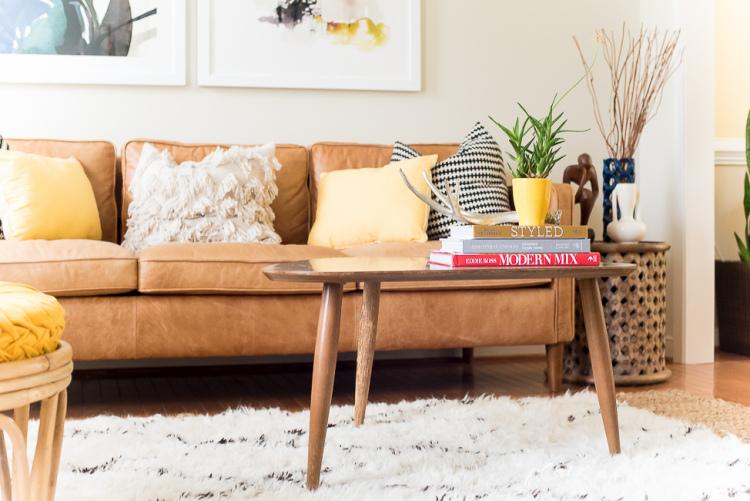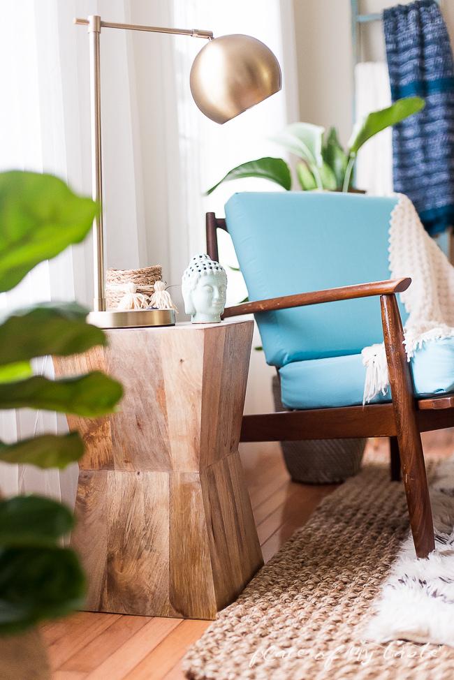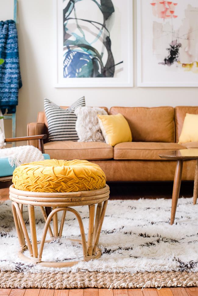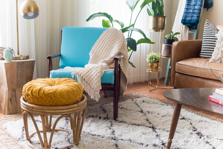 El resto de elementos se mantuvieron más fieles a la estética boho chic que inicialmente pretendía conseguir: el reposapiés de ratán con un actualizado cojín amarillo, el soporte de madera para las plantas, la superposición de una alfombra de yute con otra Beni Ourain más esponjosa,…