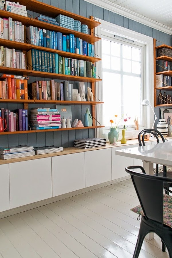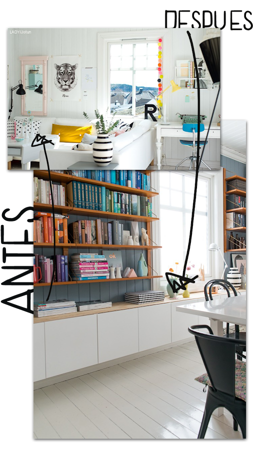 Al lío, que me lío! de momento nos quedamos con un antes&después, os parece? Los propietarios de este espacio lo habían diseñado como sala de estar, pero se les quedaba corto el almacenaje de la casa. Solución? Redistribuir los espacios, cambiar de lugar el sofá, aprovechar con estanterías la pared del fondo, pintarla para darle vida, y situar la mesa de comedor (in love total con el MIX de sillas!) en el centro. Además, una idea que nos encanta, es que utilizaron muebles altos de cocina de Ikea (como en el baño de hace unos días, os acordáis??) para aumentar los armarios, manteniendo el presupuesto a raya. Bien, no?