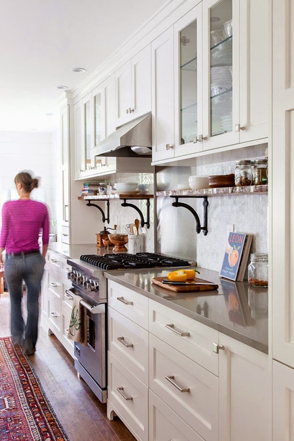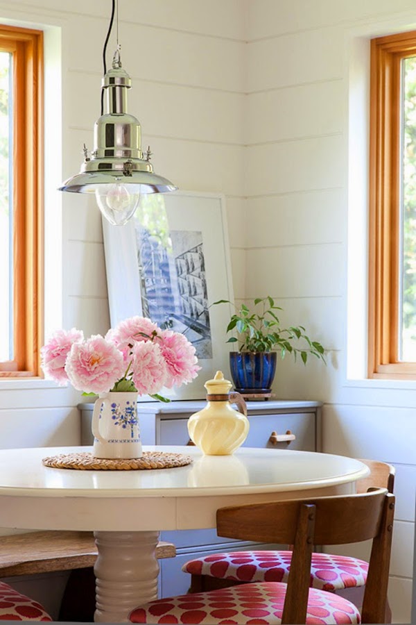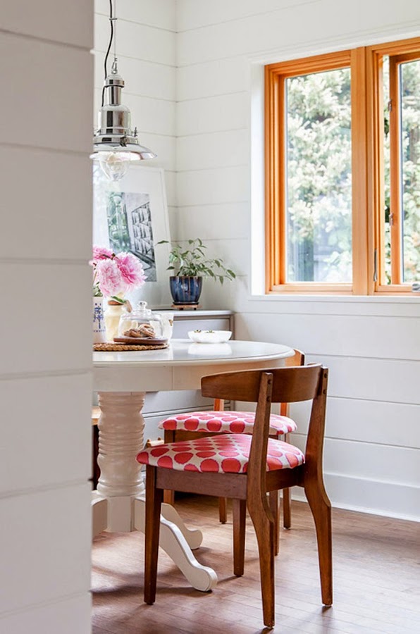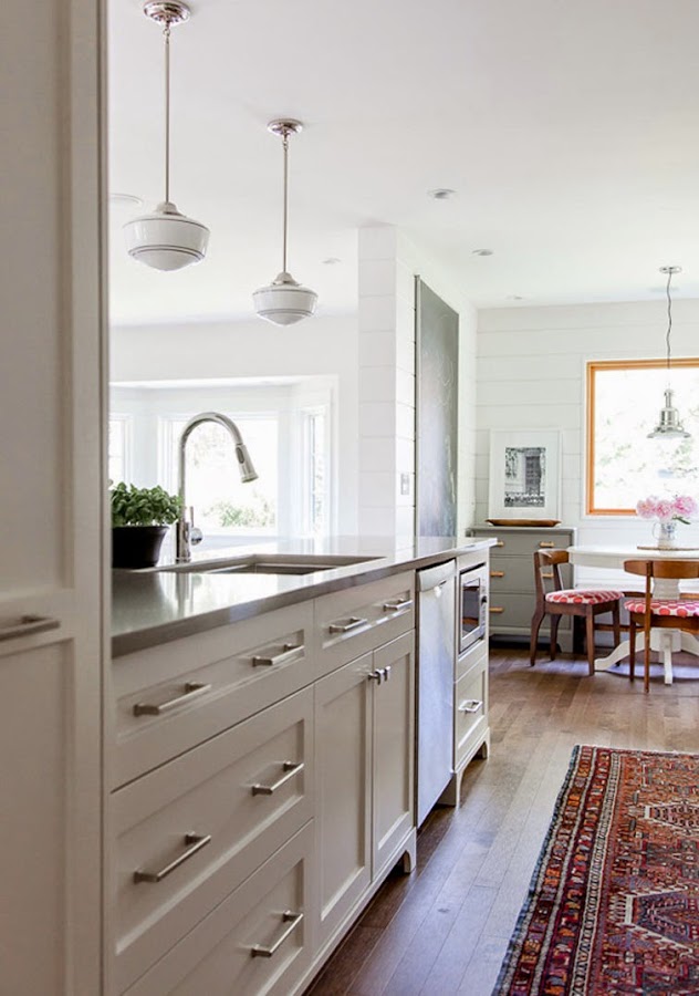 Cada detalle cuenta! Os digo las cosas que especialmente me han gustado: por supuesto, empezamos por el blanco. Blanco y más blanco por todas partes, lo que significa cocina que multiplica la luz natural con la que cuenta. Rincón bajo la ventana: qué os voy a decir? Junto a las dos cómodas (puestas de manera simétrica para que guarde todo armonía) y la gran pizarra de la pared hacen de esta parte, mi favorita. Menudo rincón más majo para comer, hacer deberes, manualidades con los enanos... No quiero olvidarme de la pequeña repisa para desayunos y que abre la cocina al resto de la casa. Me gusta, es verdad, aunque no acaba de convencerme. Para mi estilo, es demasiado clásica, sin embargo, me quedo con la idea (que de eso se trata) y paso por alto el estilo de los taburetes (es un DIY de los propietarios) y la pequeña columna (quizá excesiva).