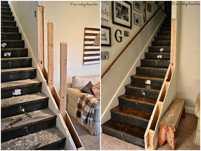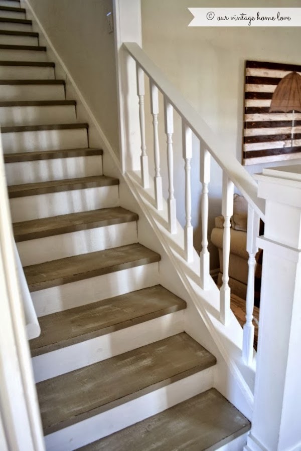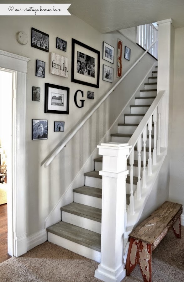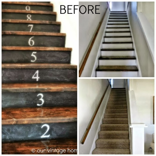Y es que el titulo lo dice todo....hoy vengo con una de esas reformas que la ves y te entran unas ganas locas de ponerte manos a la obra (por lo menos a mí). El caso es que Diana, del blog Our vintage home love (totalmente recomendable visitarlo para ver sus transformaciones), tenía en su casa una escalera que nunca le gustó de modo que ella y su marido Johnny decidieron darle un nuevo aire. Originalmente la escalera estaba enmoquetada, como podéis ver en la foto de abajo, y el primer cambio fue pintar la contrahuella de un color oscuro y ponerle los números. Aún así seguía sin gustarles y después de encontrar unos palos de baranda que se podían reciclar, con paciencia, un poco de esfuerzo y mucha ganas......¡voilà!