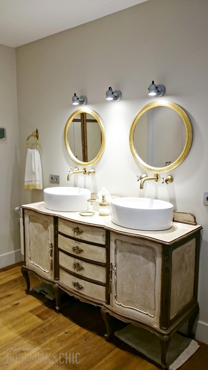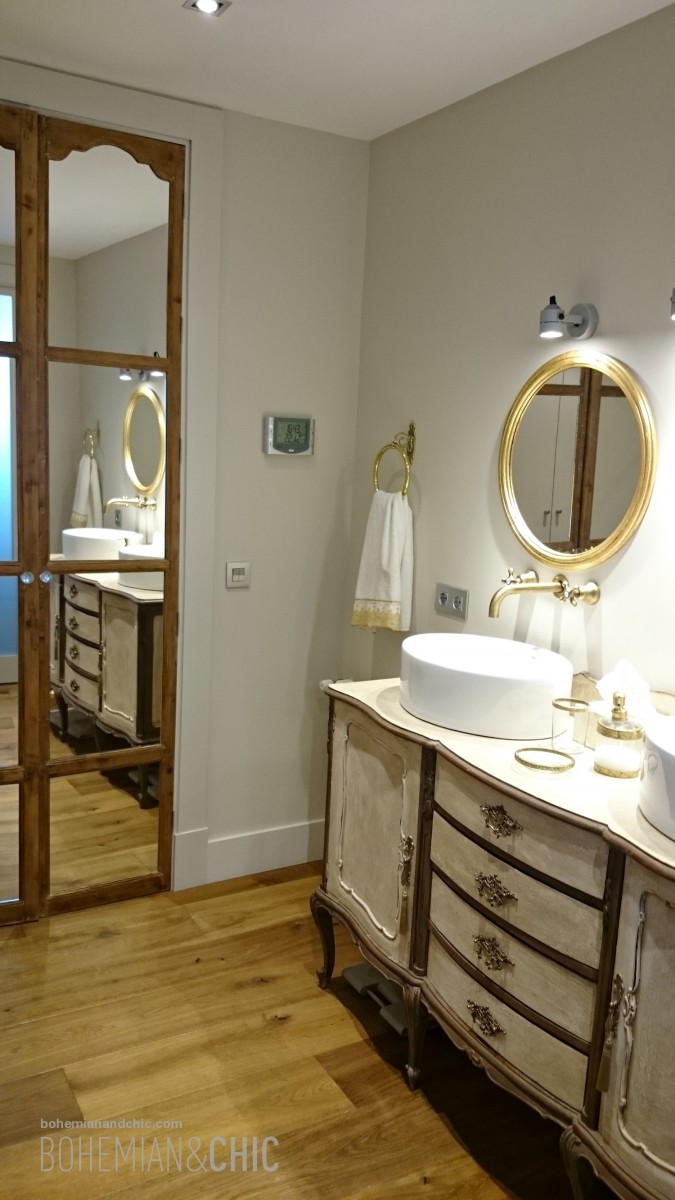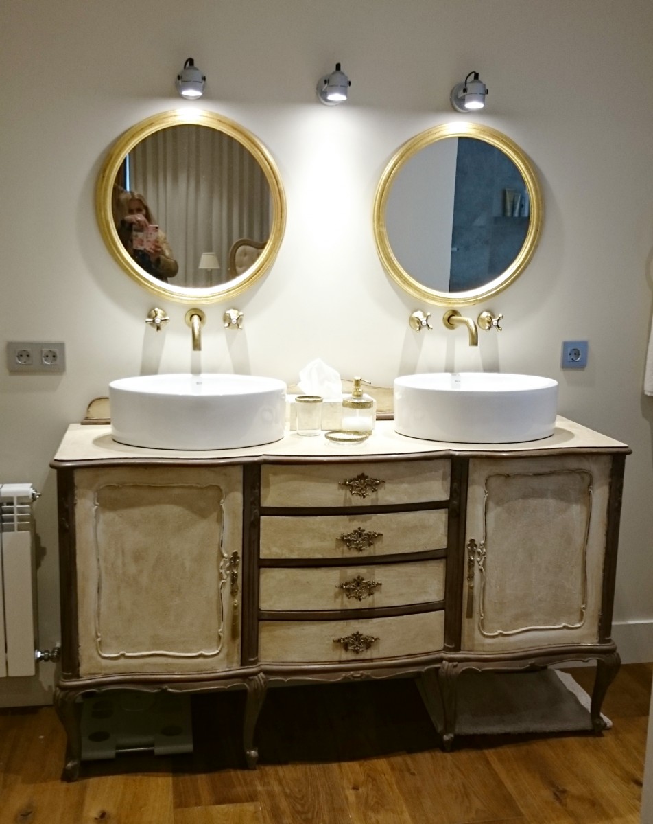 La utilidad del aparador era ser mueble bajo lavabo.Ideal por sus dimensiones para integrar dos lavamanos y de gran capacidad para almacenaje.Aquí se optó por dos labavos redondos de estilo moderno para jugar con el contraste de antiguo y moderno.