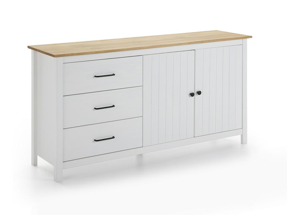 Natural/Blanco 40 x 80 x 150cmEl aparador Kuma en color blanco presenta una tapa superior elaborada en madera de pino con acabado natural en cera. El resto de su estructura está elaborada en madera de pino y se compone de una sección dividida por una balda, cubierta por una puerta corrediza con acabado en reja y 3 cajones amplios, cada uno con un par de tiradores de uñero.