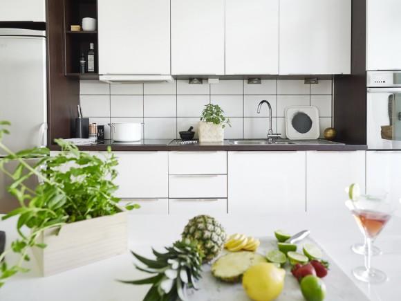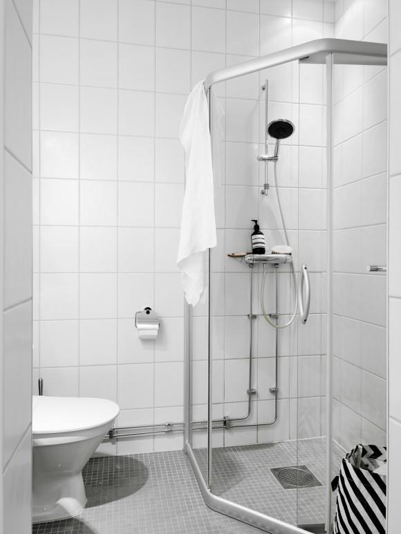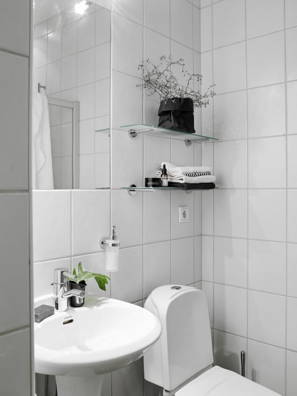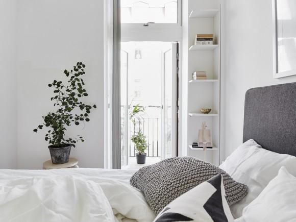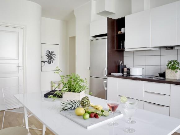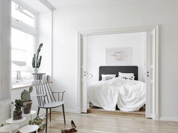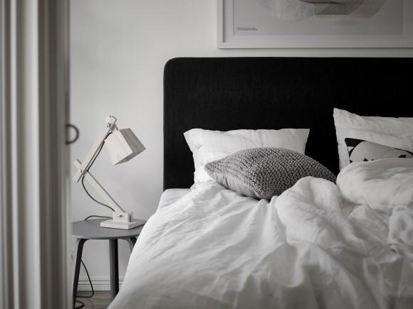 Este pequeño apartamento se encuentra situado en Vasastaden, Estocolmo. A pesar de su reducido tamaño tiene un encanto que seguro que a todos nos gustaría vivir en él. El blanco es el color predominante en el ambiente, transmitiendo paz y serenidad, y se complementa a la perfección con elementos negros, grises y de madera natural. Algunos de estos elementos que contrastan con ese ambiente tan tranquilo y sereno son el cabecero y el sofá, con tonos más oscuros, confiriéndole más personalidad. Las láminas de las paredes que encontramos también continúan esa misma gama cromática de blancos y negros, homogeneizando todo el conjunto.