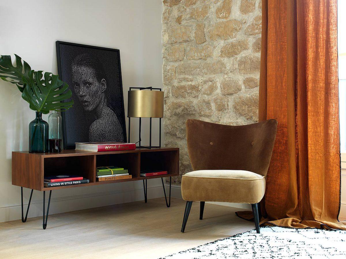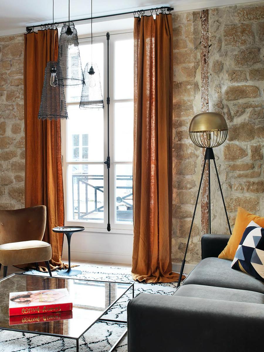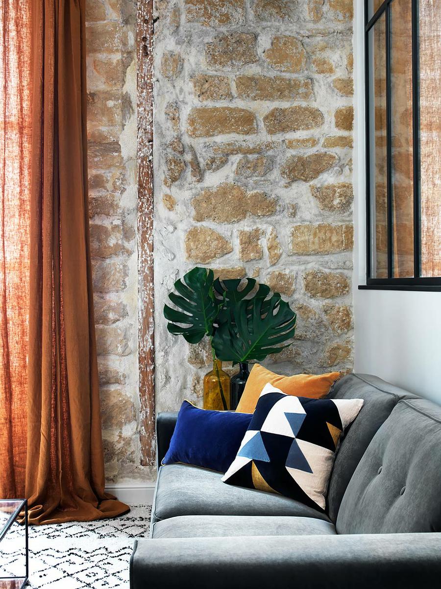 Encontrar la esencia de este apartamento es sencillo, tan sólo con descubrir el muro de piedra típico de las construcciones de los ‘faubourgs’ parisinos, la inspiración nos retrotrae a los lofts. Todo el espacio se derribó, incluida la chimenea. A partir de este espacio en blanco se diseñó un gran interior compartido por el salón y la cocina abierta con una barra como comedor, un baño y un dormitorio con vestidor, separado del resto mediante un tabique con ventana en hierro, inspirada en los talleres industriales. Todo el apartamento se ha decorado con piezas vintage y nuevas creaciones de líneas delicadas, terciopelos y toques de colores vivos, como el mostaza y el azul Klein, como el papel pintado que hace las veces de cabecero en el dormitorio.