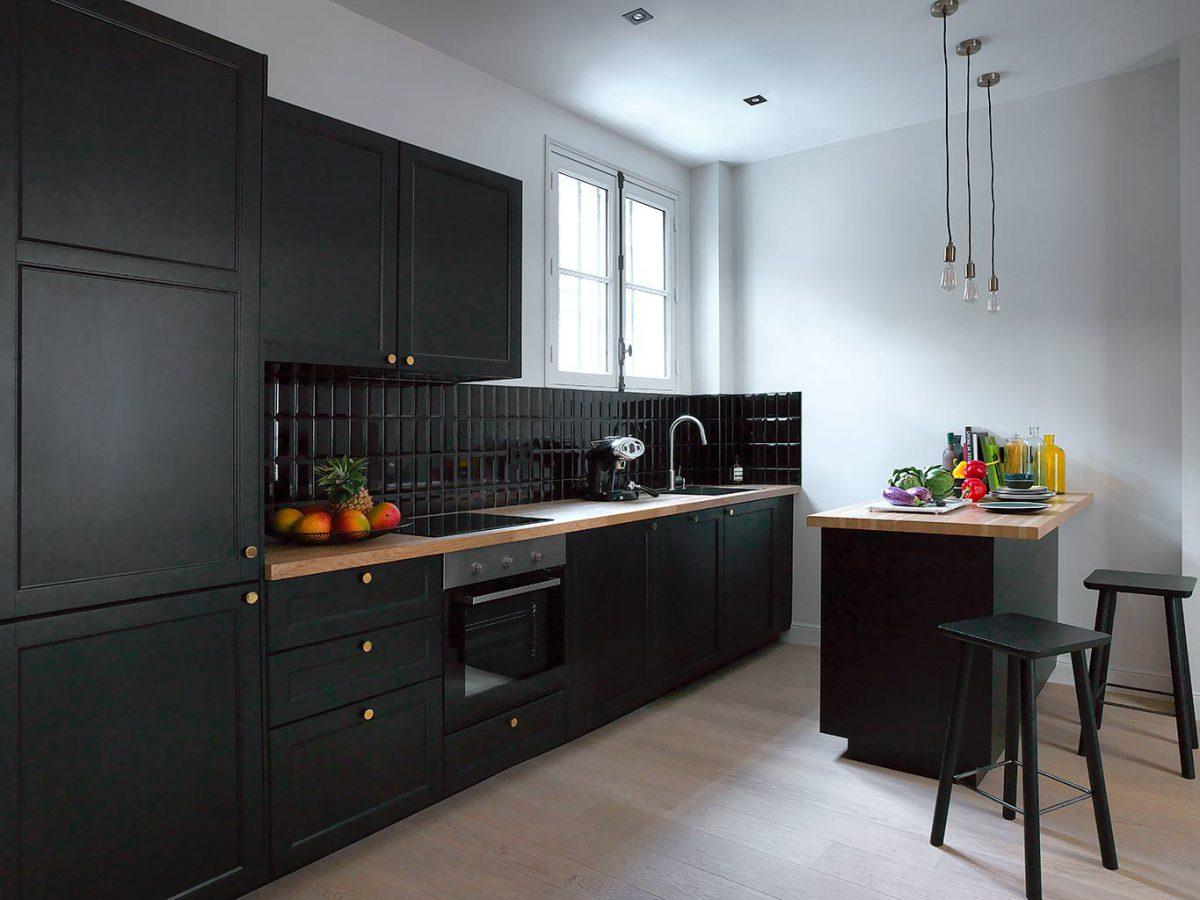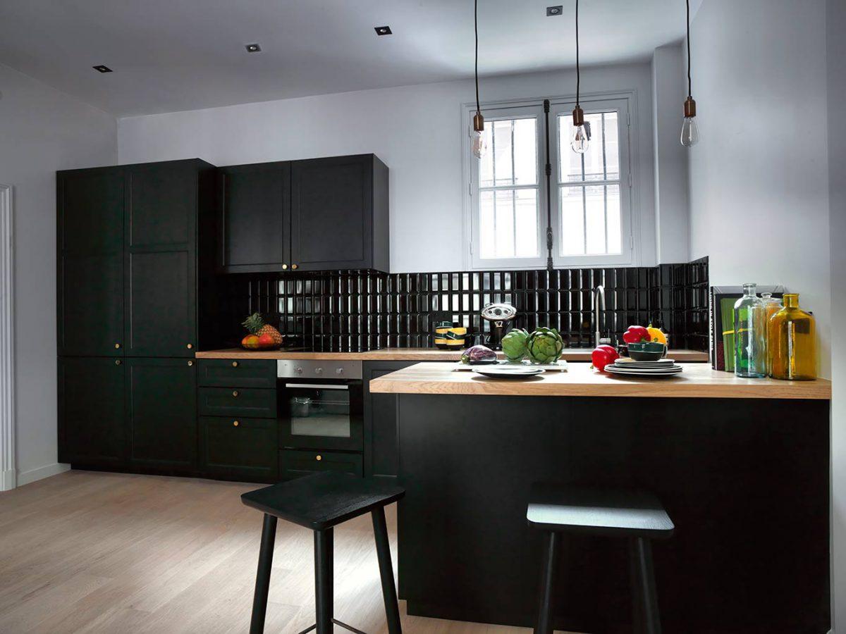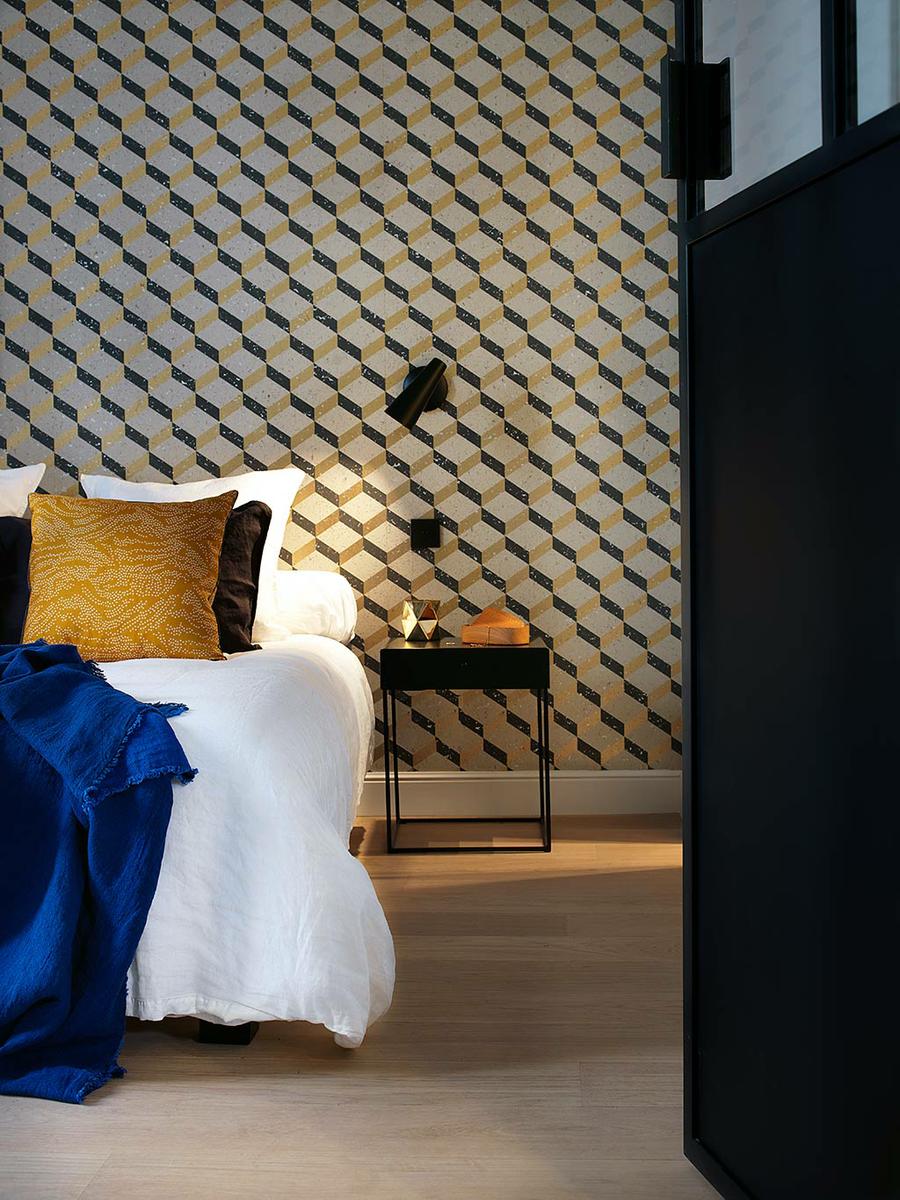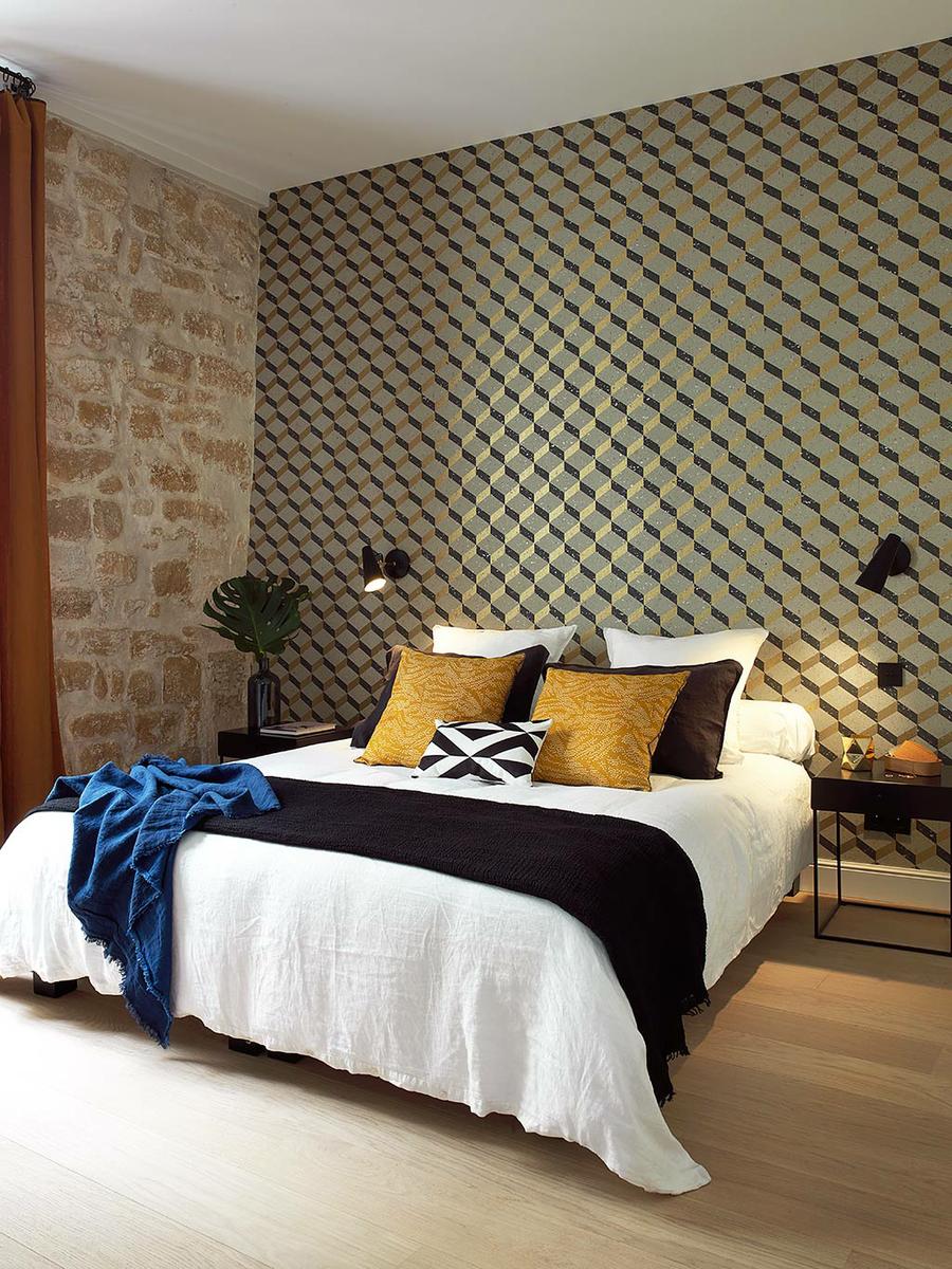 Encontrar la esencia de este apartamento es sencillo, tan sólo con descubrir el muro de piedra típico de las construcciones de los ‘faubourgs’ parisinos, la inspiración nos retrotrae a los lofts. Todo el espacio se derribó, incluida la chimenea. A partir de este espacio en blanco se diseñó un gran interior compartido por el salón y la cocina abierta con una barra como comedor, un baño y un dormitorio con vestidor, separado del resto mediante un tabique con ventana en hierro, inspirada en los talleres industriales. Todo el apartamento se ha decorado con piezas vintage y nuevas creaciones de líneas delicadas, terciopelos y toques de colores vivos, como el mostaza y el azul Klein, como el papel pintado que hace las veces de cabecero en el dormitorio.