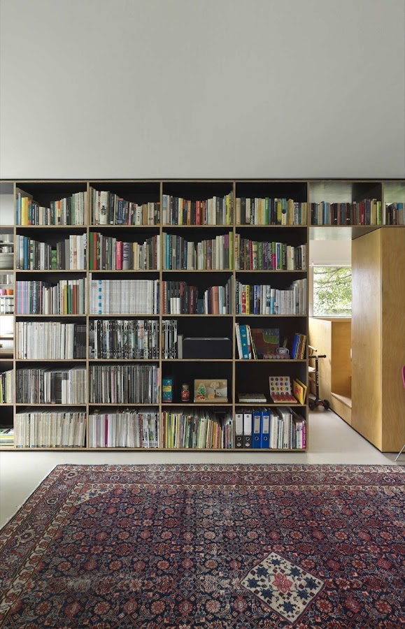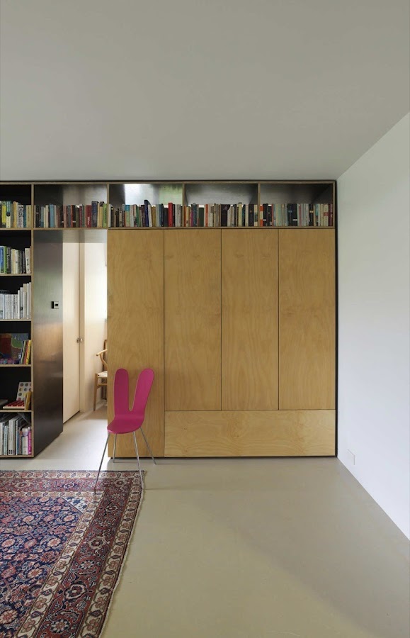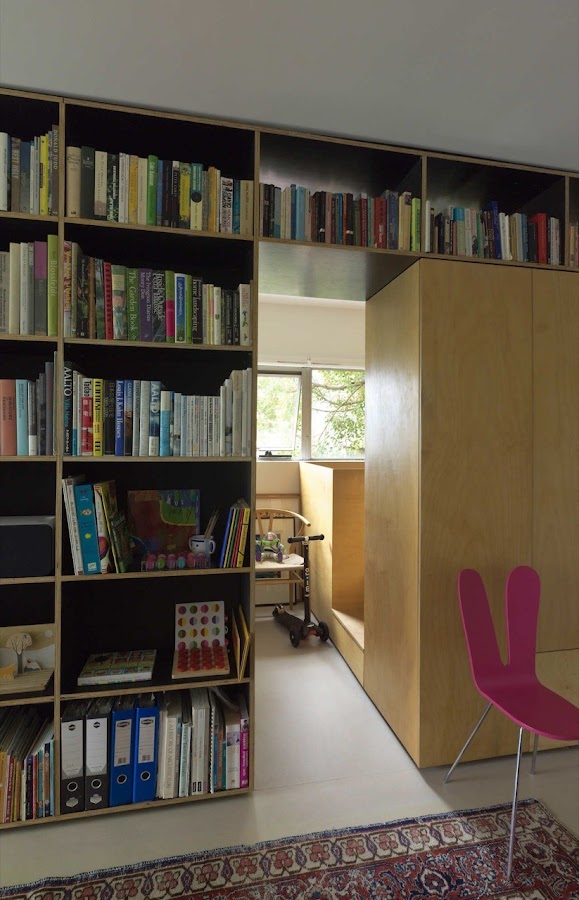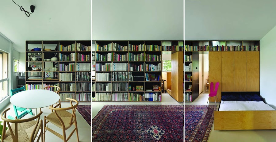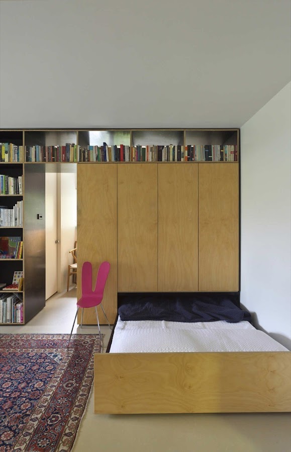 Al ser un apartamento tan pequeño se tuvieron que buscar fórmulas para sacar el máximo provecho a todo el espacio que tienen. Ya es una fórmula de aprovechamiento muy buena la división del apartamento con la librería, ya que dota a la casa de una gran zona de almacenamiento y decoración, además de darle un espacio separado de lo demás a la cocina, el baño y la habitación infantil. ¿Como consiguieron para la habitación principal? Pues prescinden de ella, pero situaron bajo la habitación infantil la cama de matrimonio que se desliza para colocarse en el salón.