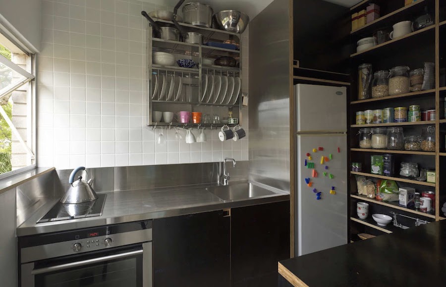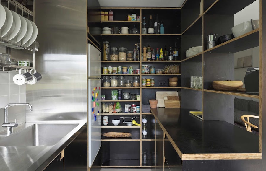Cuando yo digo que me vale cualquier "agujero en la pared" para hacerlo mi hogar hablo de esto. Hacer de cualquier sitio genialidades para decorarla y conseguir que sea un sitio que merezca la pena vivir. Decorativamente hablando lo que más me gusta de este pequeñísimo apartamento es la cocina. A pesar de que el negro no sea mi color preferido, la combinación de los muebles negros con el canteado de color madera ha quedado genial en la cocina, además de que el orden que tienen los dueños de este apartamento con los alimentos, ayudan a ver todo de otra manera. ¿Qué os parece a ustedes este apartamento? ¿Podrían vivir sin claustrofobia? Yo creo que si...