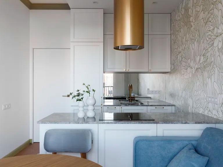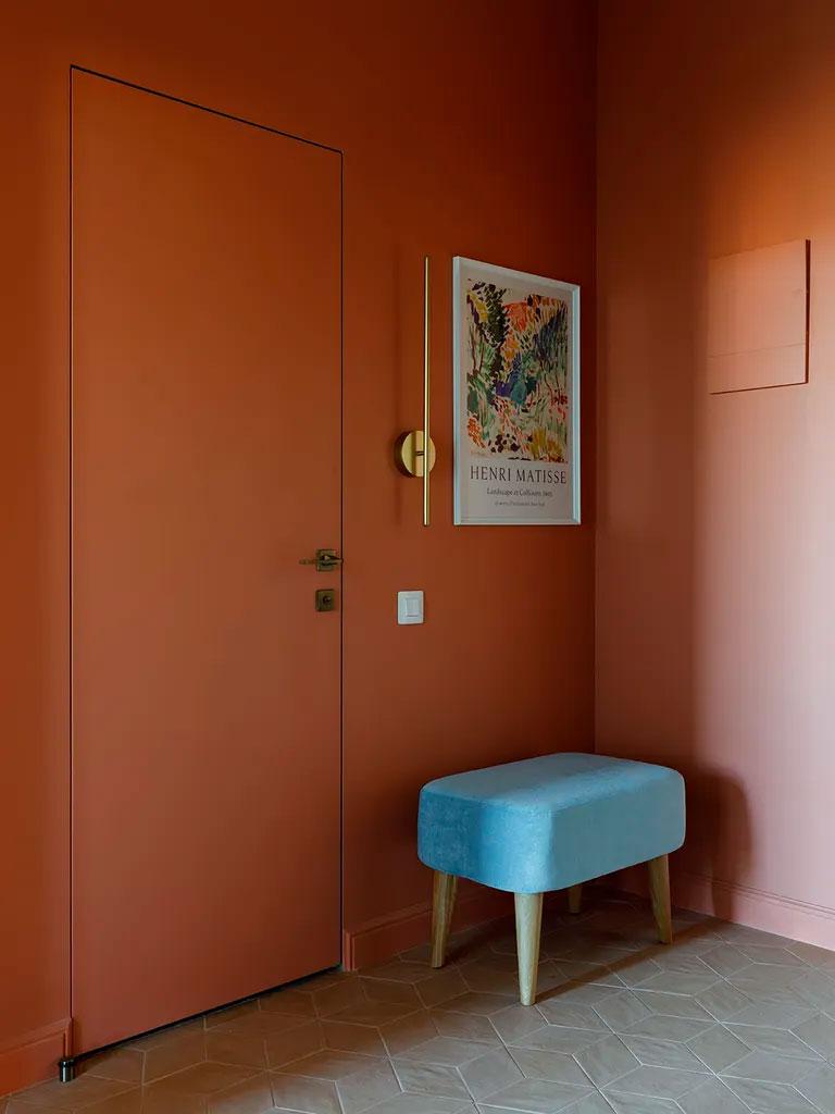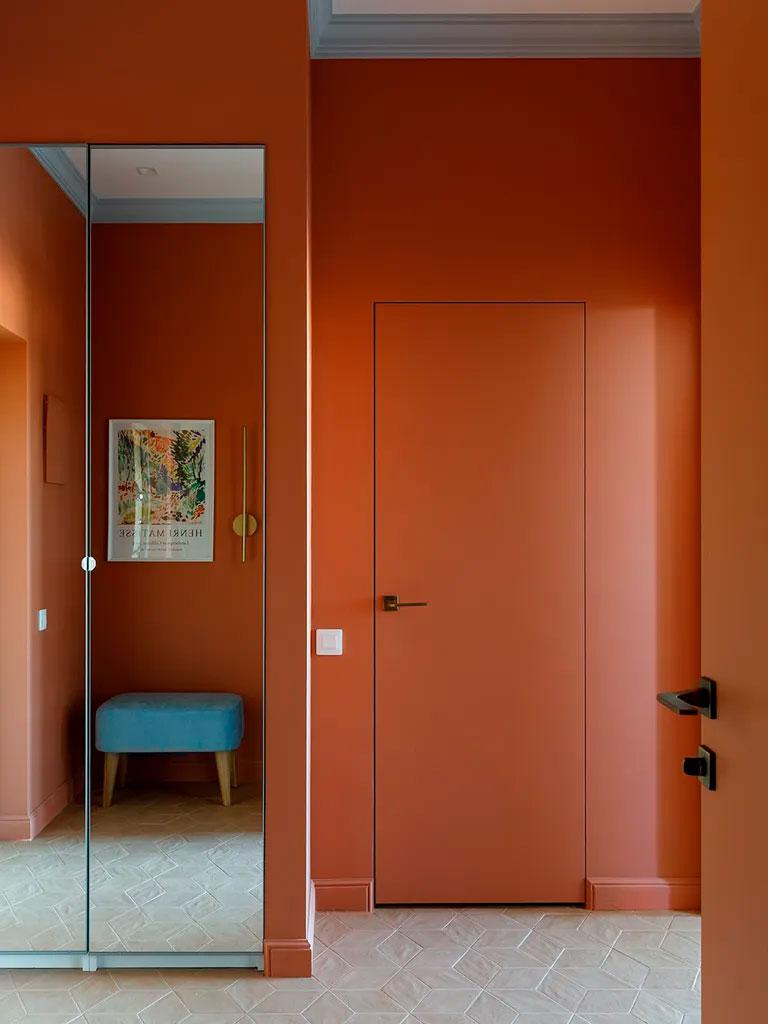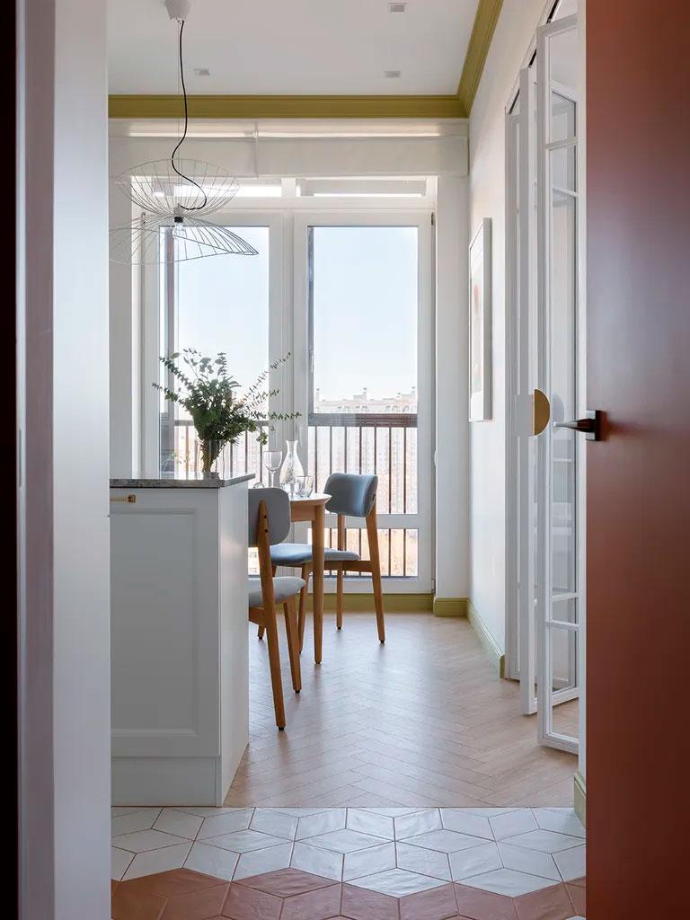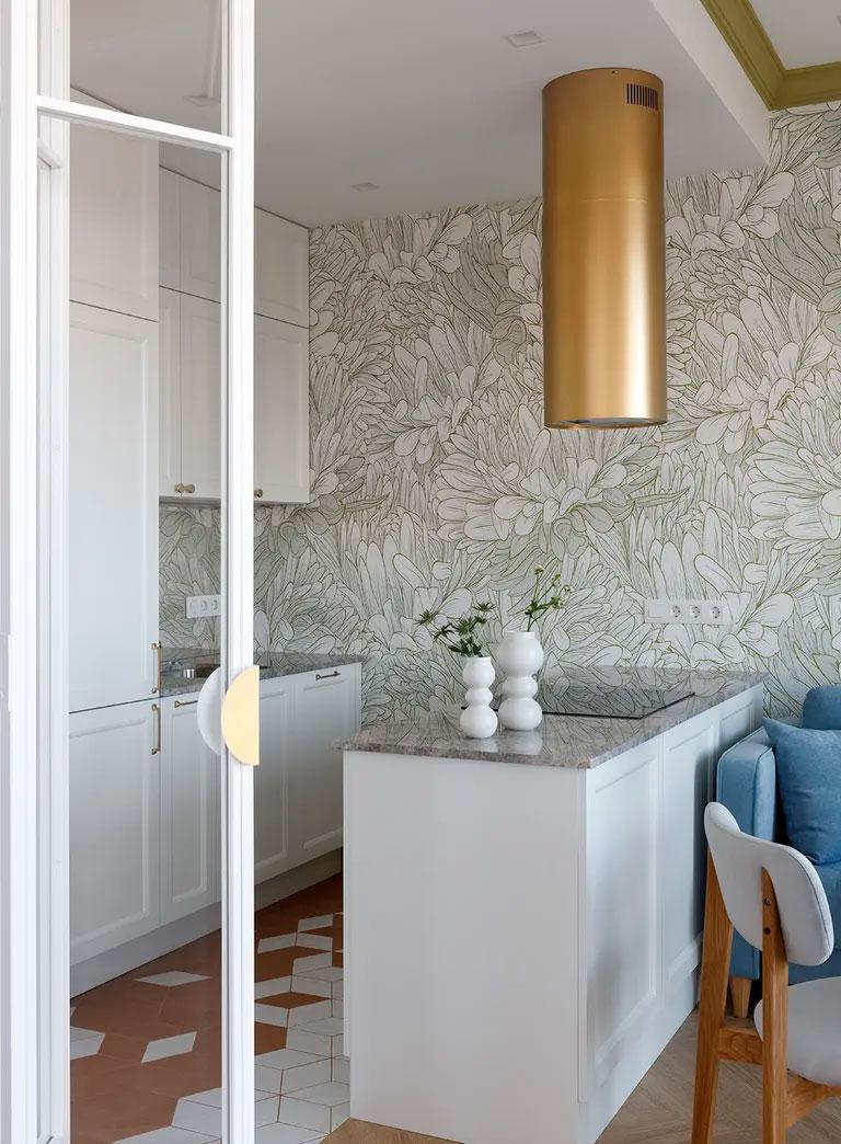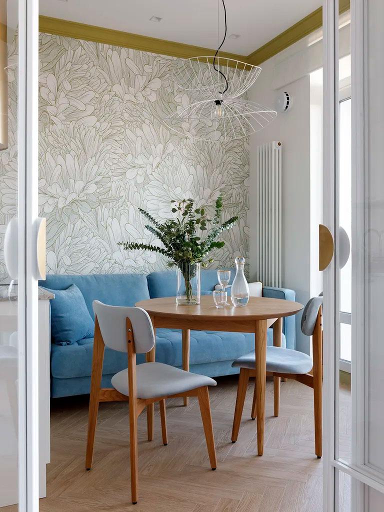 Este piso en San Petersburgo de 50 metros cuadrados, me ha llamado mucho la atención porque creo que tiene muy buenas soluciones de almacenaje, en todas y cada una de sus estancias. Se han utilizado los mismos colores como hilo conductor del apartamento, así, el terracota, el azul cielo y el verde, discurren por todas las estancias. El estudio de interiorismo Yuhome Design quiso transmitir por un lado el frescor del verano, en un sitio carente de sol la mayor parte del año, para ello utilizó los colores azul y verde o el bonito papel pintado de la cocina y el salón-comedor y por otro, cierta calidez con el terracota, en un lugar particularmente frío.