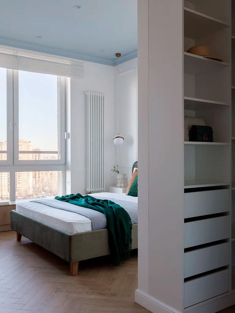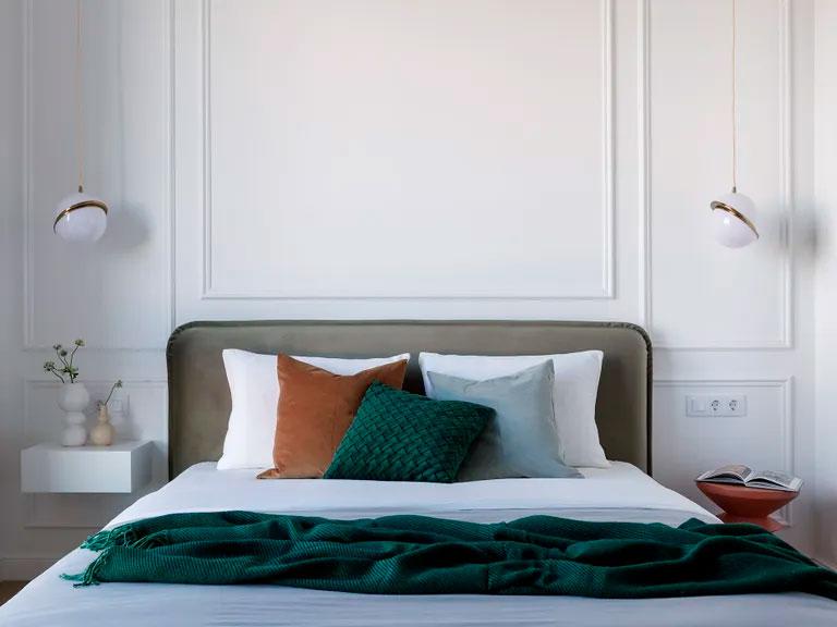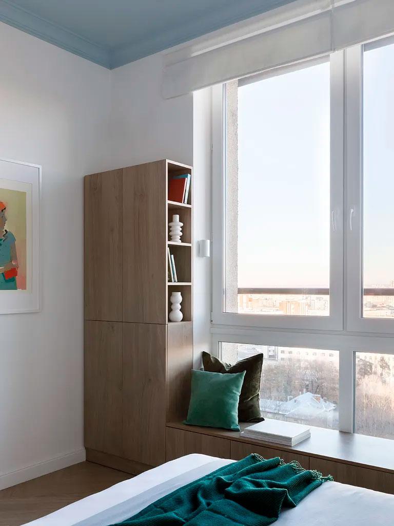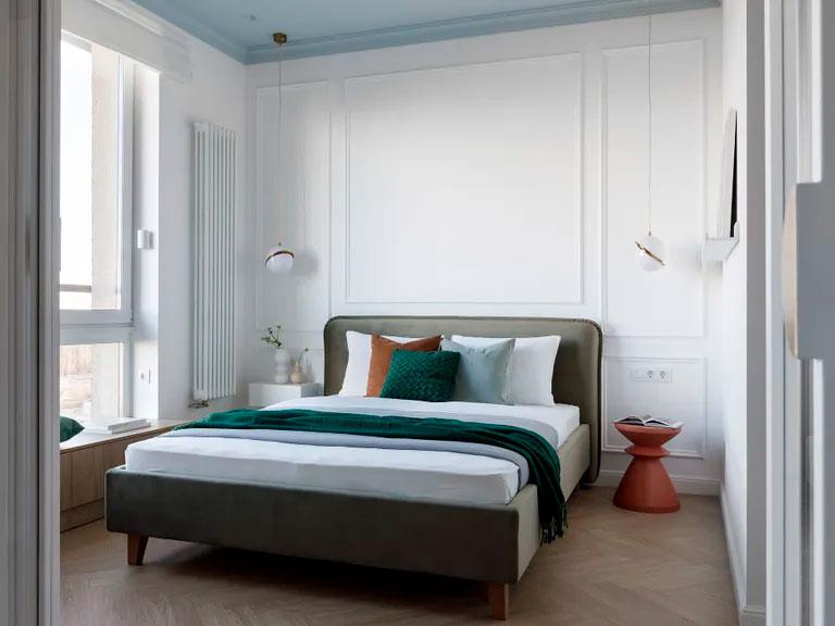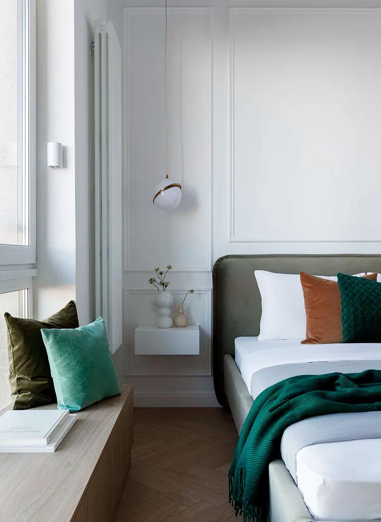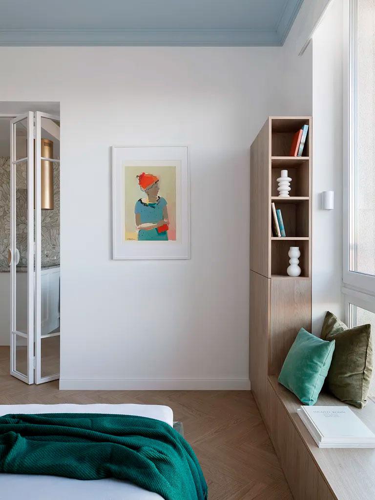 En el dormitorio volvemos a ver el mix de azul cielo (en el techo), los verdes (en textiles) y terracotas (en la mesilla de noche), todo ello rodeado por bonitas molduras en color blanco. En esta habitación se aprovechó también la parte baja de la ventana para crear un mueble a medida, un banco diseñado como rincón de lectura que se extiende a lo largo de la pared creando una estantería con partes abiertas y otras cerradas. Si os fijáis en el cuadro junto a dicho mueble, vemos que también sigue la misma gama cromática.