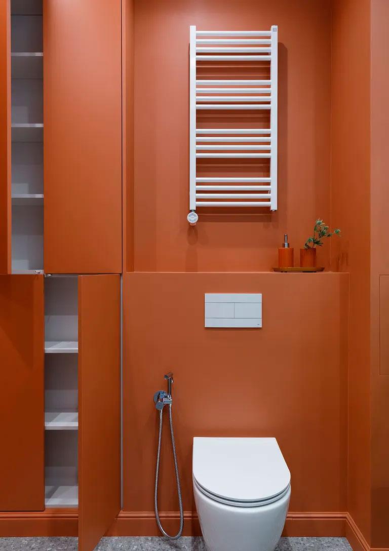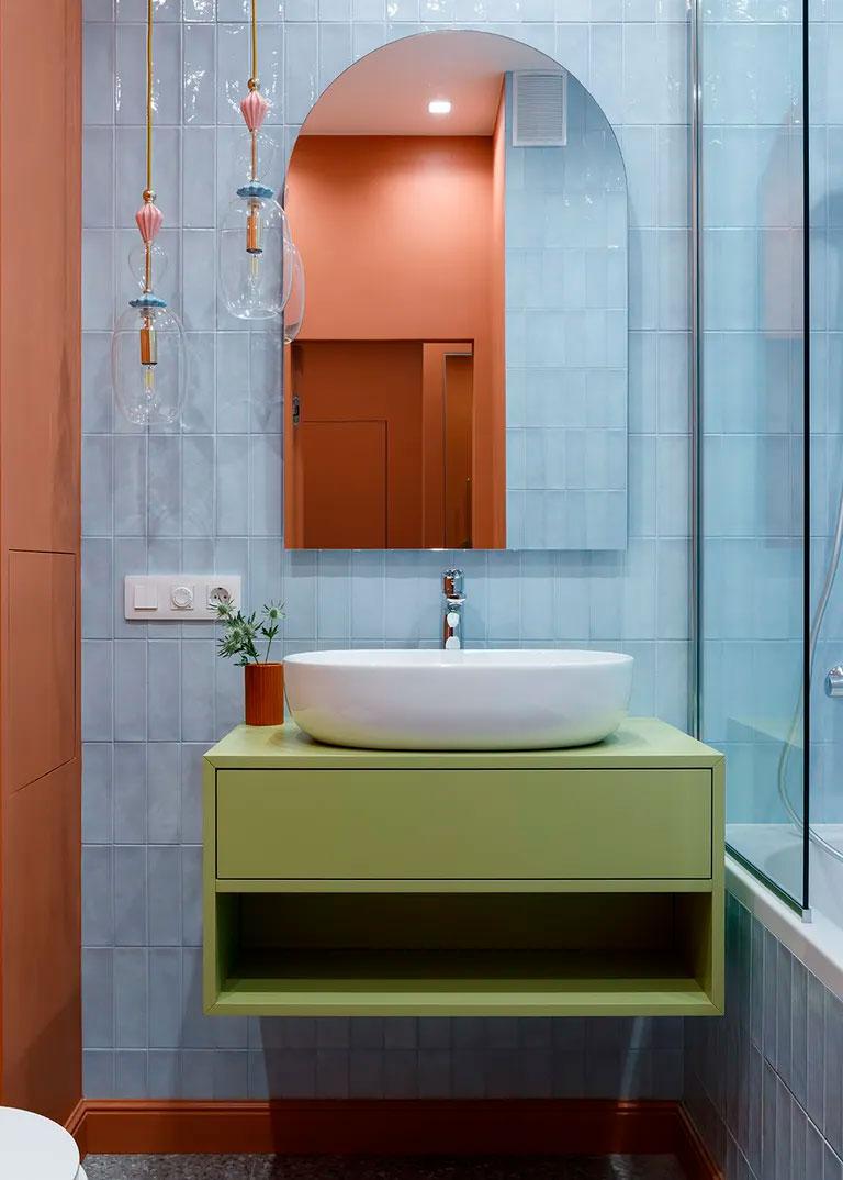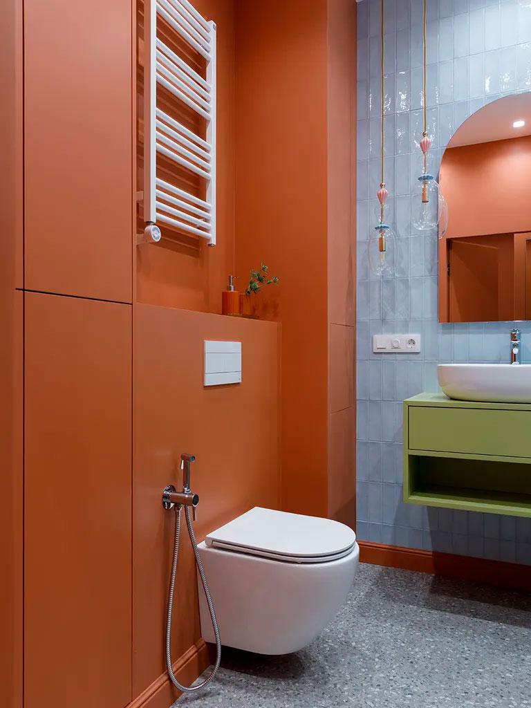 El vestidor era una de las necesidades de la propietaria, en esta casa no se ha escatimado en almacenamiento. De ahí llegamos al baño donde se repiten nuevamente los colores, unas paredes en terracota, azulejos en azul celeste y un mueble suspendido en verde, y se aprovechan todos los espacios para crear zonas de almacenaje. El inodoro al estar empotrado en la pared, crea una repisa donde poder dejar objetos decorativos y donde además, se aprovecha el retranqueo para poner el radiador de pared. Como veis los bidés pasaron a mejor vida, desde que existen las griferías que se instalan junto al inodoro y cumplen la misma función de lavado sin ocupar tanto espacio, es algo que se está instalando en casi todas las casas (ahora, hay que tener cuidado con su manejo o la presión del agua puede hacer que te jueguen una mala jugada y acabes mojando todo el baño :-)). Se ha aprovechado también para hacer un armario de suelo a techo junto al inodoro, desde luego no puede ser un espacio más completo.