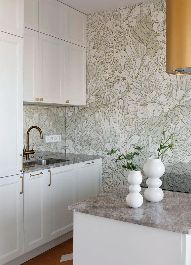 En las zonas comunes, el papel con motivos florales es el protagonista. El verde podemos verlo en las molduras del techo y el azul, en el sofá. Por todo el suelo (menos en la zona de la cocina), discurre un parquet de espiga que le da un aire distinguido al apartamento. El salón tenía una pequeña terraza que se cerró ganando una zona de lectura con un gran puf en un lado y un banco de almacenaje en el otro.