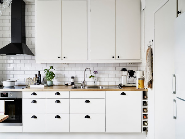 Saben que me gusta recordaros que es lo que más me gusta de la casa y en esta casa lo he tenido fácil: el papel que decora con tanta alegría y naturalidad la cocina de la casa. La verdad es que el mercado hoy día nos da muchas posibilidades con el papel pintado, hay miles de diseños para todo tipo de usos, infantiles, naturales, de rayas, estampados, texturas... cualquier cosa. Aquí se ha conseguido una mezcla ideal de colores: blanco, madera, negro y el verde a través del papel pintado y a las plantas que tiene distribuidas por toda la cocina. Vean ustedes, seguro que os gusta tanto como a mi.