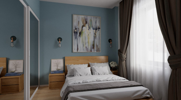 Un dormitorio, en el que se ha escogido para la pared del cabecero un tono de azul más claro y las puertas del armario son de espejo completamente de suelo a techo, dando más amplitud al mismo