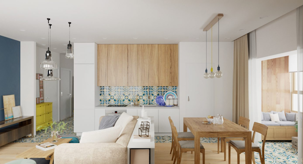 El salón - comedor - cocina, es un luminoso espacio todo en uno. Un concepto que sigue estando en auge, en el que textiles, mobiliario y elementos fijos están totalmente coordinados. Dispone de una terraza semi-incorporada que se ha aprovechado para instalar un pequeño rincón de trabajo. En la que contrasta el suelo tipo baldosa hidráulica, con la pared y el techo revestida en un acabado madera.