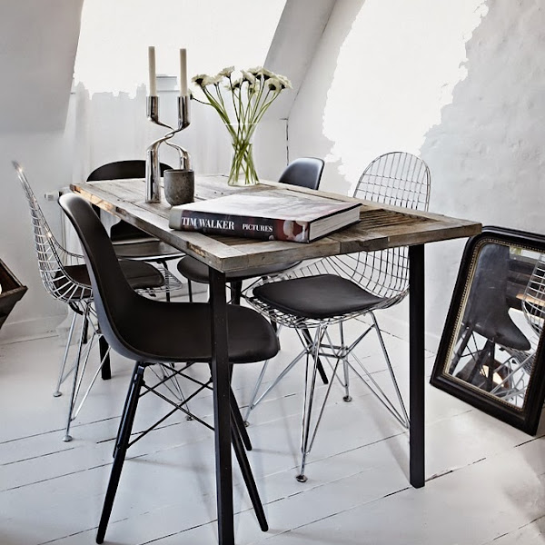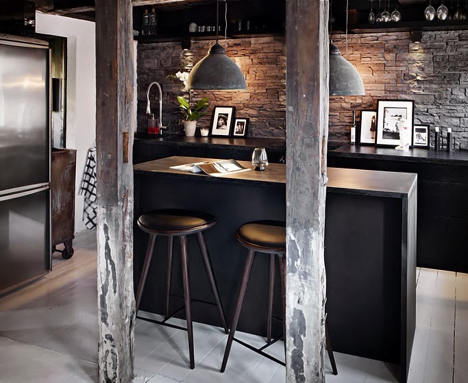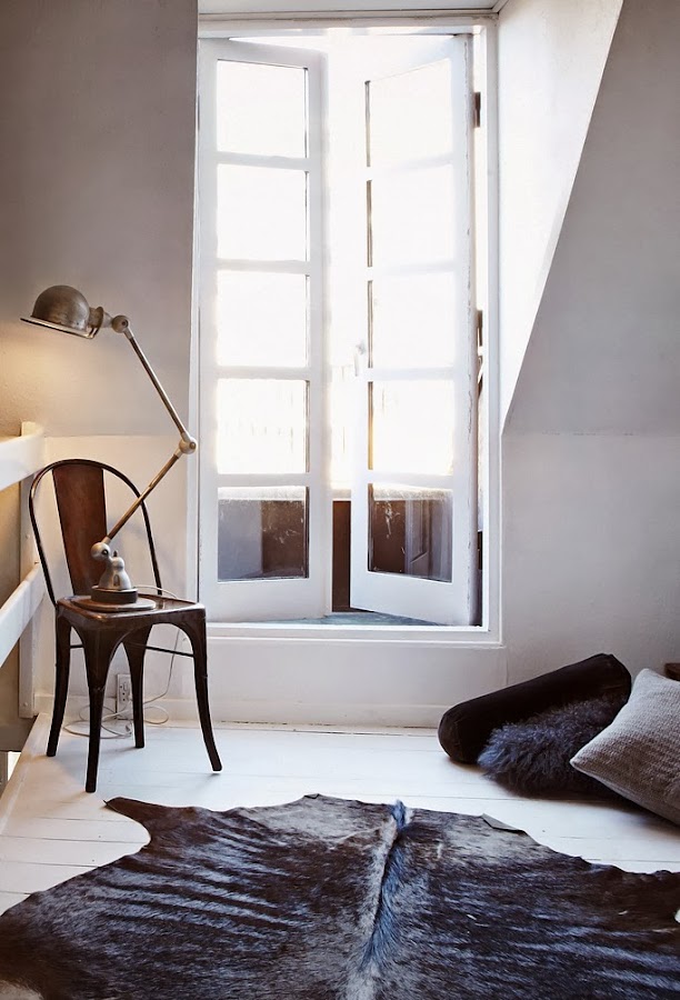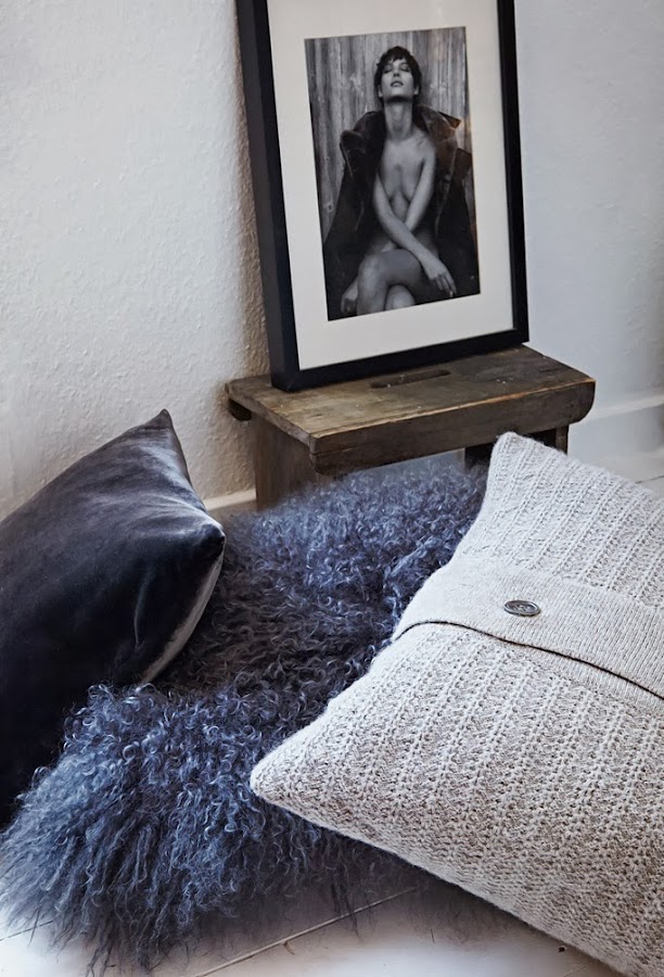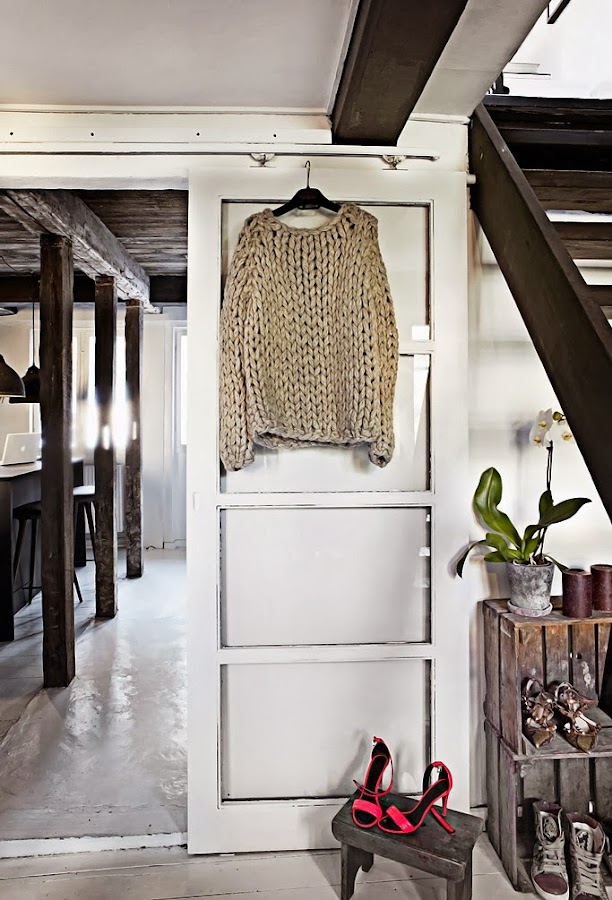 Llaman la atención los muebles de aspecto pesado, como el armario tipo taquillas encontradas en "el mercado de las pulgas", la mesa hecha a partir de una antigua puerta a la que se le han colocado unas patas de hierro o las imponentes lámparas que cuelgan sobre la isla. En contraste tenemos toques modernos como el candelabro de diseño sobre la mesa o la sillas. El dormitorio está vestido para el frío con esa alfombra de piel, cojines peludos el calorcito de la chimenea y las prendas de punto.