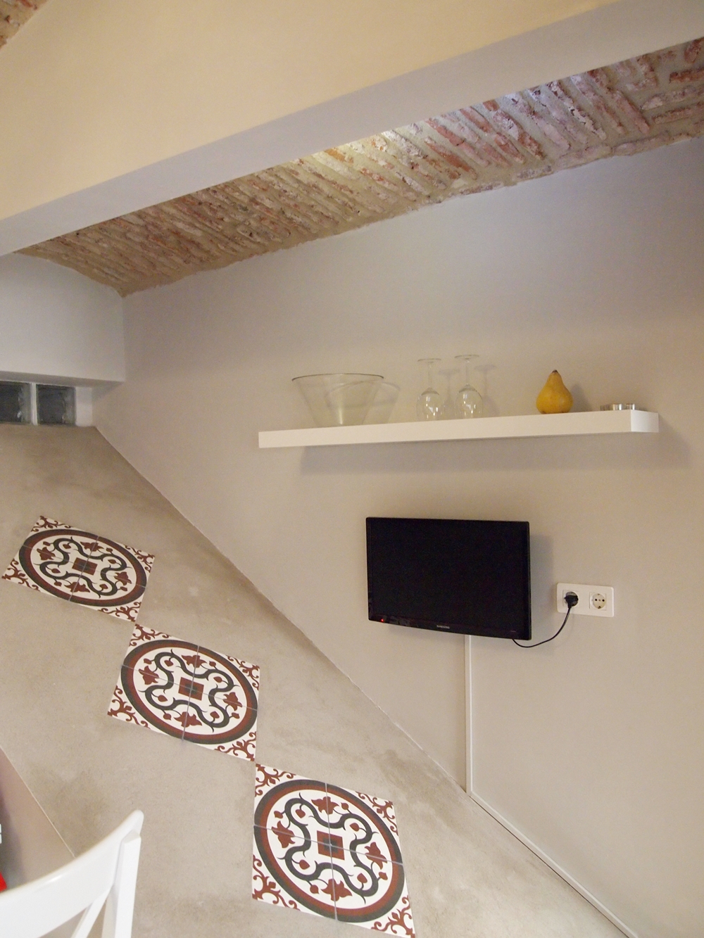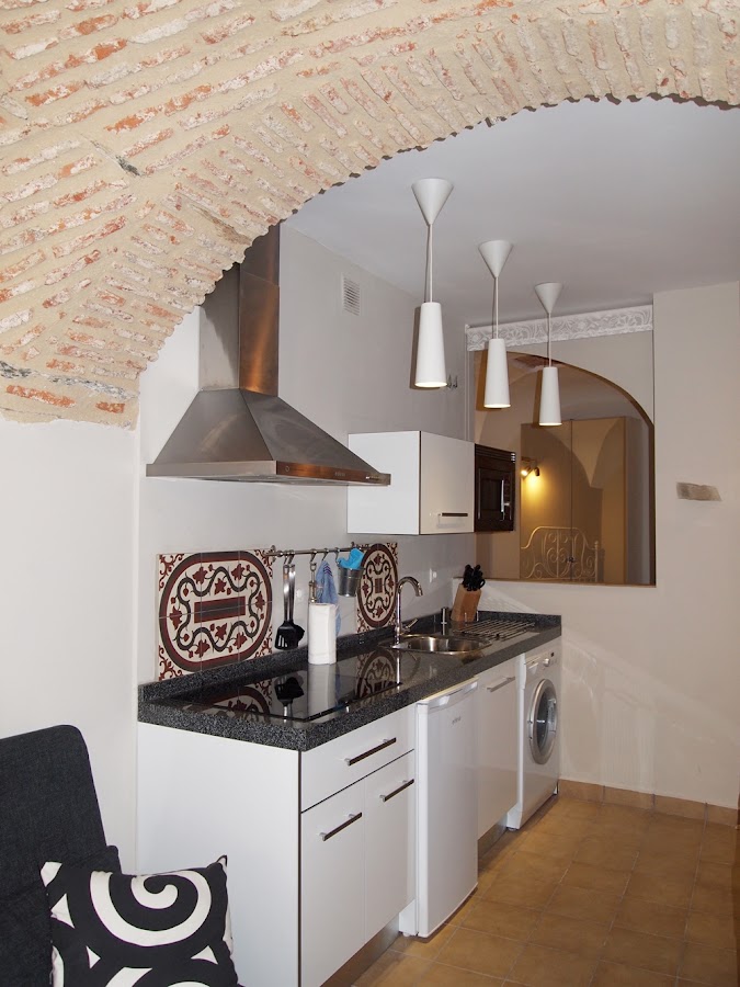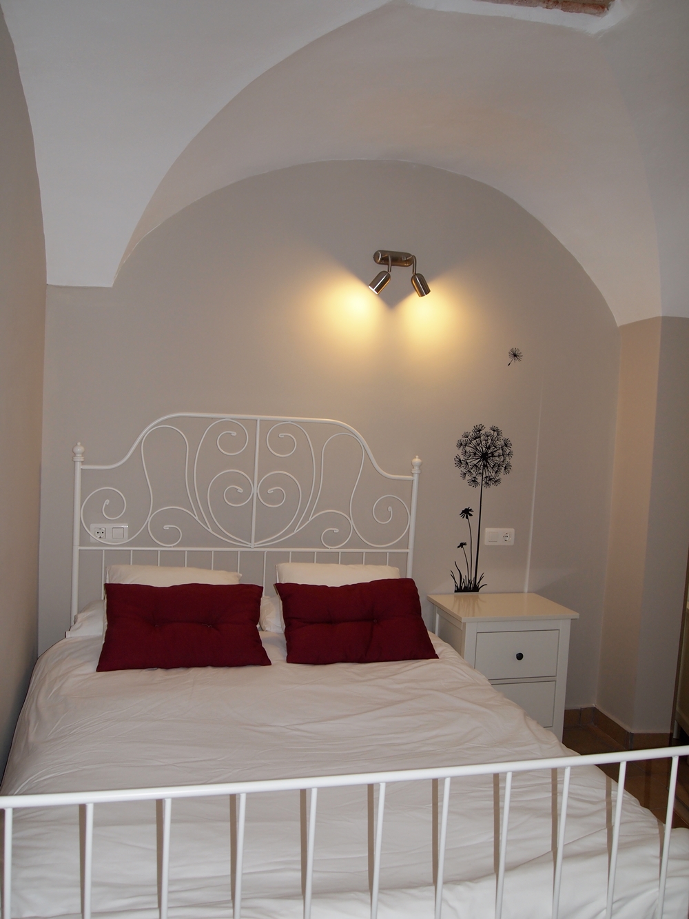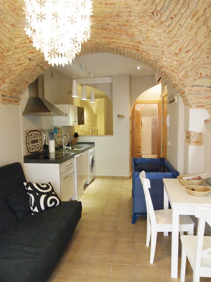 El apartamento no necesitaba una gran decoración, pues su arquitectura, llena de arcos y bóvedas ) es tan bonita que es mejor elegir mobiliario sencillo y sin grandes adornos. Sus propietarios lo hicieron a la perfección, muebles de Ikea, de estilo romántico y algunos vinilos en la pared, así como una sencilla cocina con el frente de baldosa hidráulica fueron la opción perfecta para este apartamento, que además se encuentra a tan sólo 50 metros de la Plaza Mayor de la ciudad.