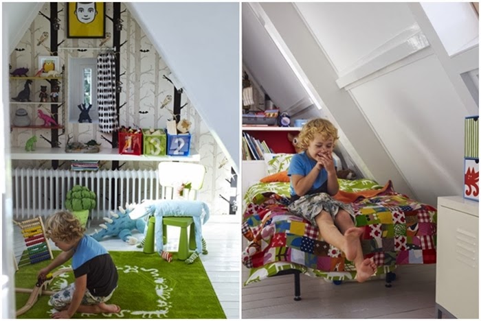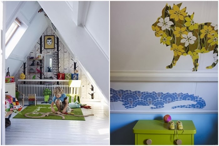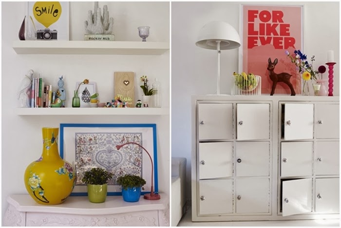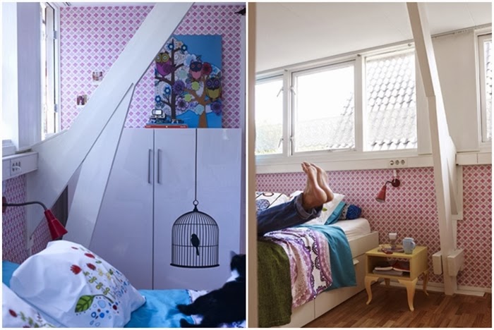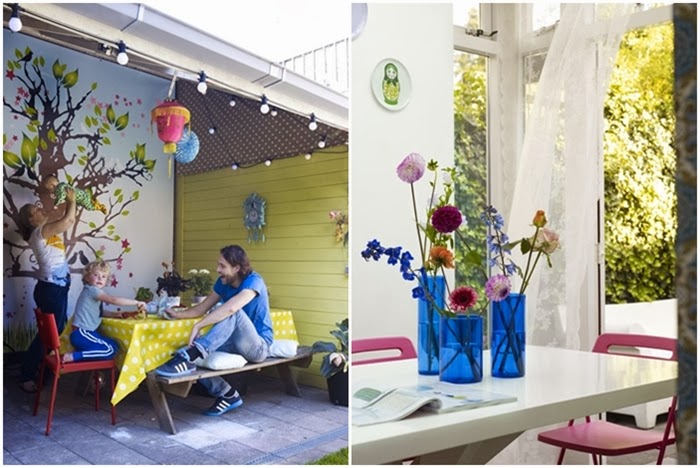 Yo a la vista de estas imágenes, me quedo con los suelos blancos, la decoración de la cocina-comedor con ese suelo de baldosa hidráulica, la nevera Smeg en rosa, los azulejos del frente de cocina, las sillas rojas, las lámparas y el papel pintado de encima de la chimenea. Un espacio lleno de magia para vivir el día a día. Una decoración donde la apuesta por el color crea espacios llenos de vida.....